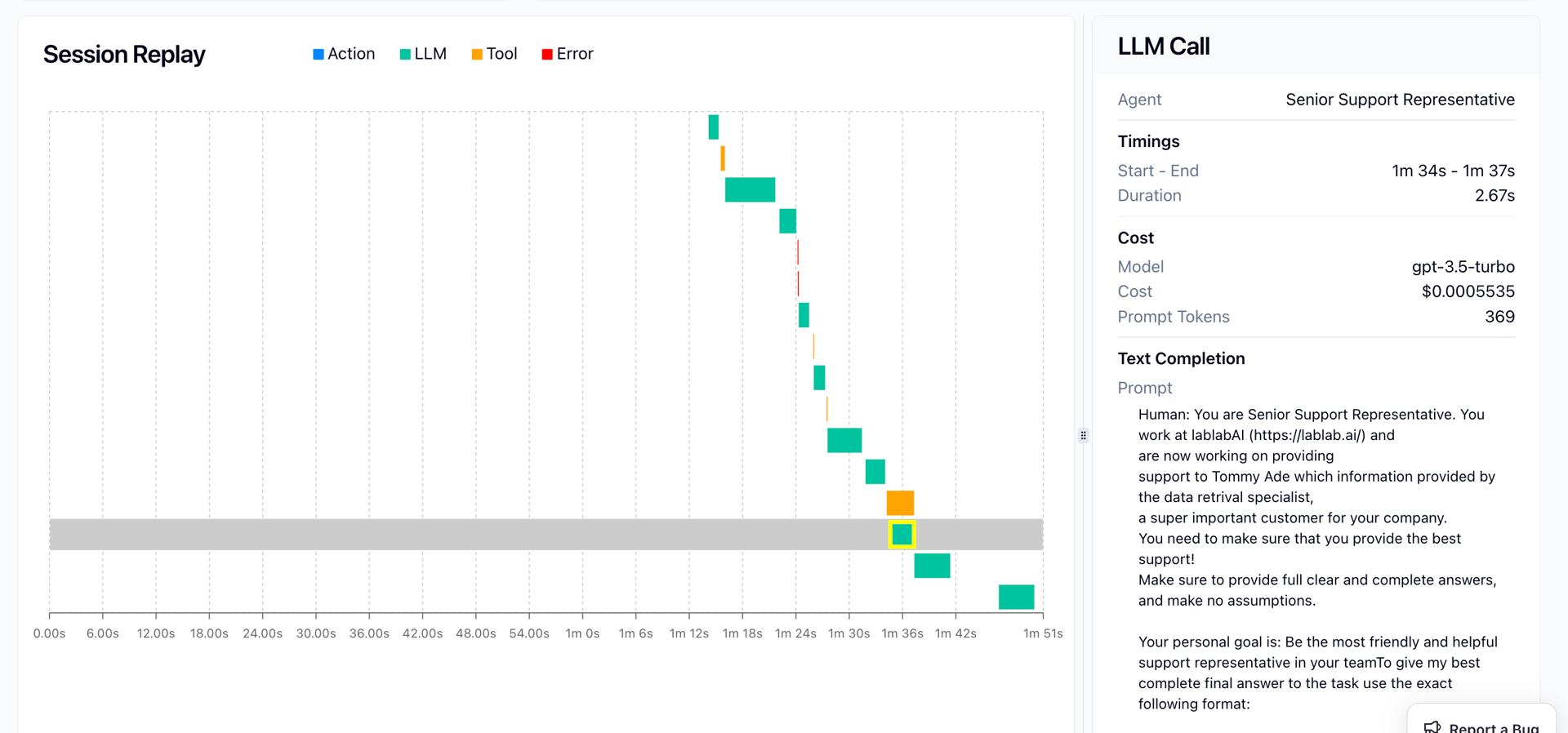 - LLM Call Details: The panel on the right shows details of a specific LLM call, including the agent name, timings, cost, model used, and text prompt. This helps in analyzing specific interactions and optimizing prompts.