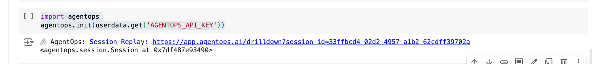 After setting up your environment variables, create a new code block to initialize your AgentOps session: