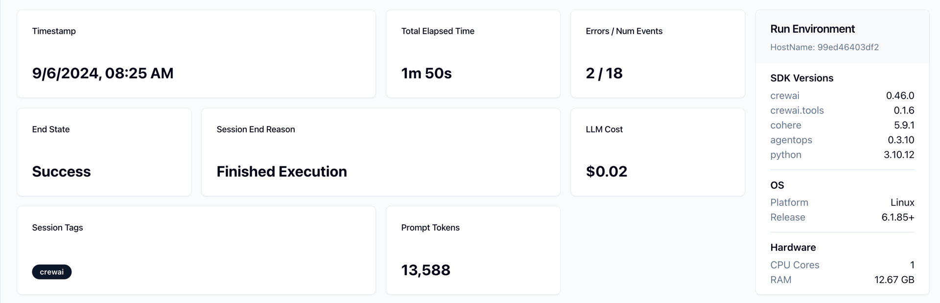 - LLM Cost and Prompt Tokens: Displays the cost incurred for using Large Language Models (LLMs) and the total number of tokens used during the session, useful for managing costs and resource allocation.