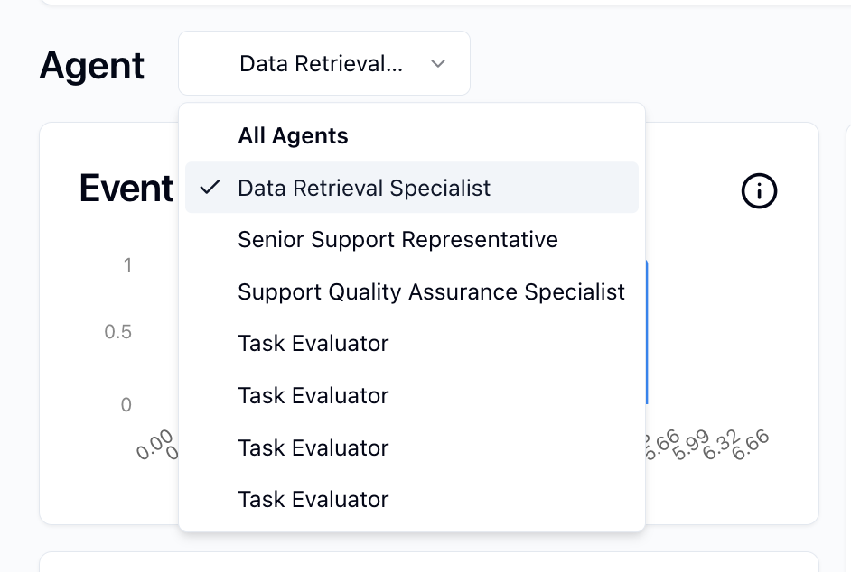- Agent Selector: This dropdown allows you to filter data by specific agents (e.g., "Data Retrieval Specialist", "Support Quality Assurance Specialist"). Select an agent to see its unique contributions and activities.