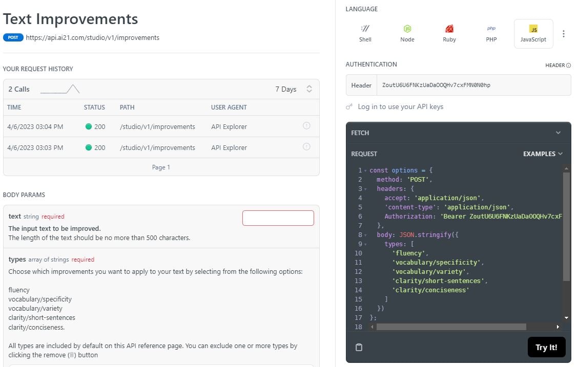 for many different programming languages. We will use the fetch method to call the API. We will use the POST method to send the text we want to improve.