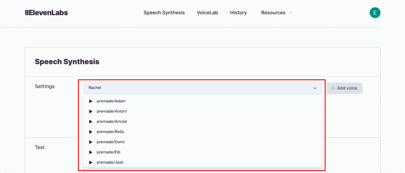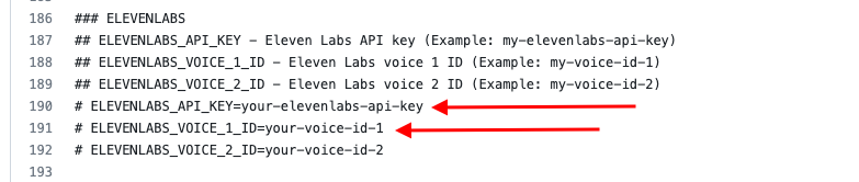 Open your .env file and replace "your-elevenlabs-api-key" with the API key you just copy and "your-voice-id-1" with wither the name of the voice you wish to use (e.g. "premade/adam"), you can find a list of the available voices in ElevenLabs' Speech Sythesis page 📝🔊
