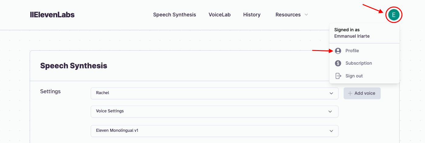 Head to ElevenLabs and create an Starters account for free, at the top right click in your profile image, then selet Profile👉🖼️