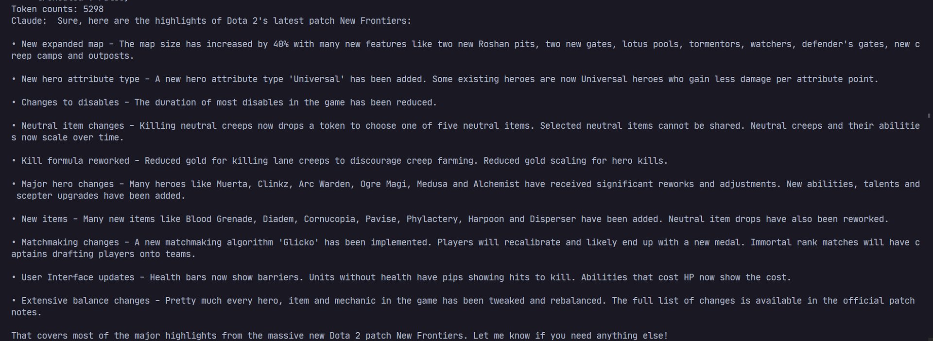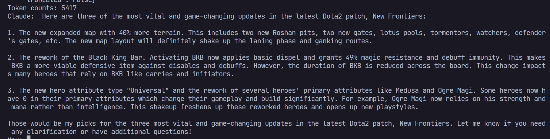 Claude impressively identified the three most game-changing updates: the expanded map with 40% more terrain, the rework of the black king bar, and the new hero attribute type: Universal. Remember, we didn't feed Claude the entire patch notes at once. Instead, it's leveraging the power of its enhanced knowledge base to retrieve this relevant information.