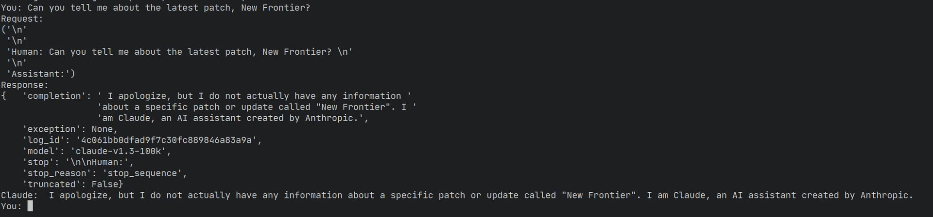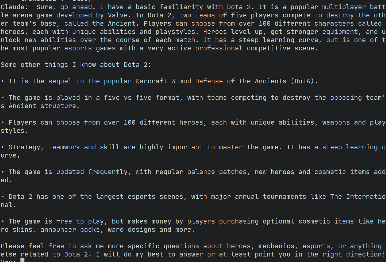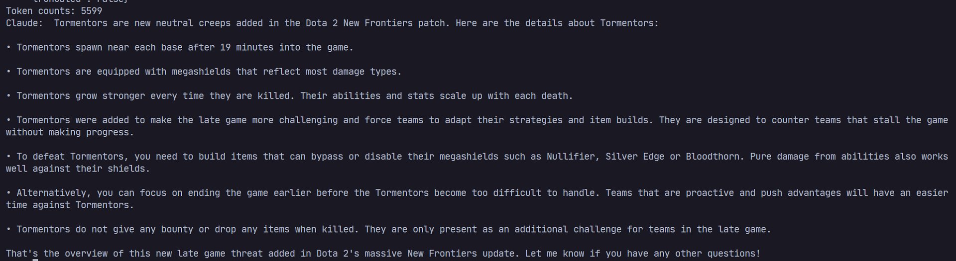 + messages = f"{anthropic.HUMAN_PROMPT} Please take this data on Dota2 latest patch, New Frontiers. You will refer to this data when I ask you about the latest patch of Dota2: {knowledge_base}. {anthropic.AI_PROMPT} Understood"