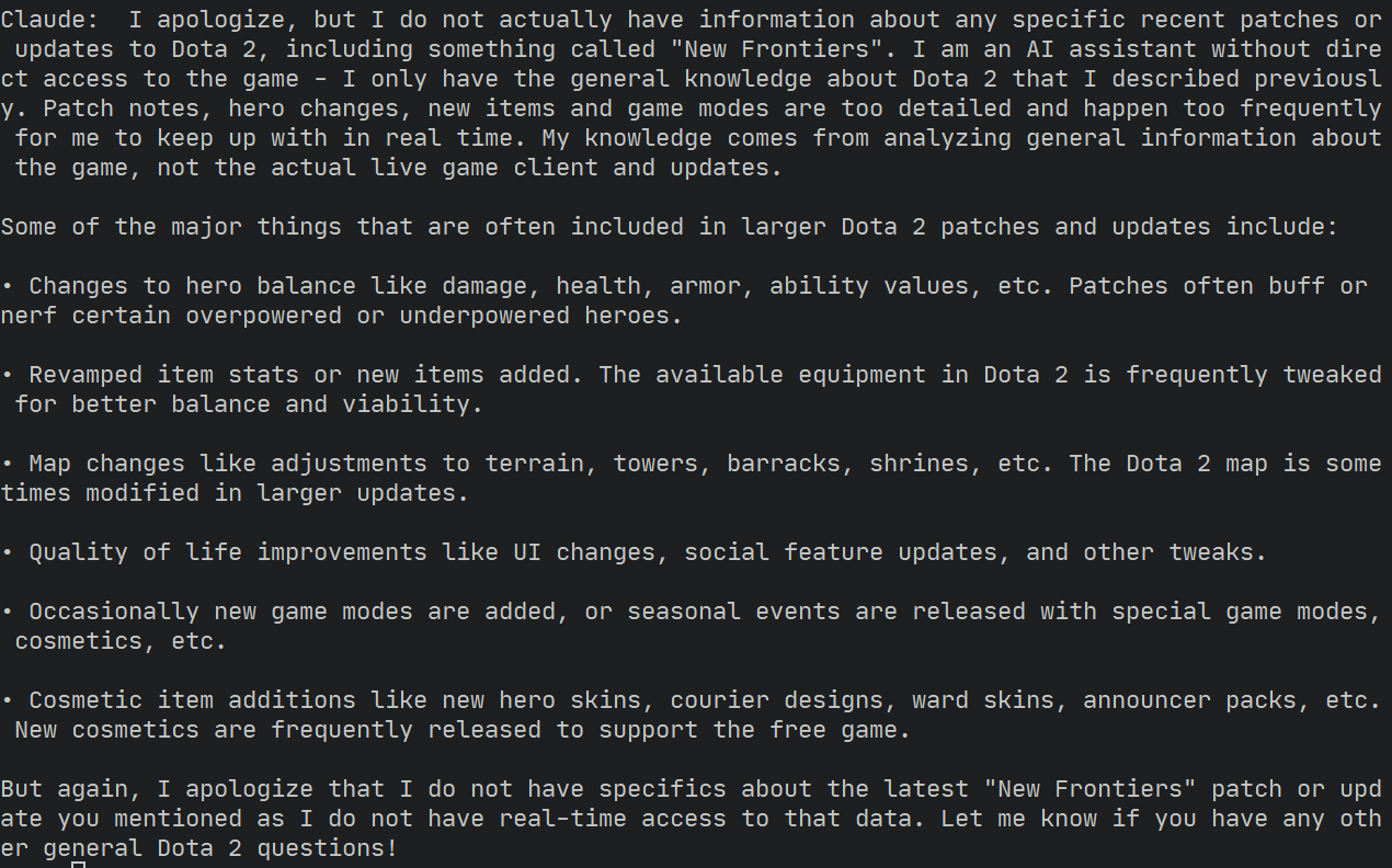 Let's put our augmented chatbot to the test! First, we'll inquire about general information concerning Dota2's latest patch, "New Frontiers".