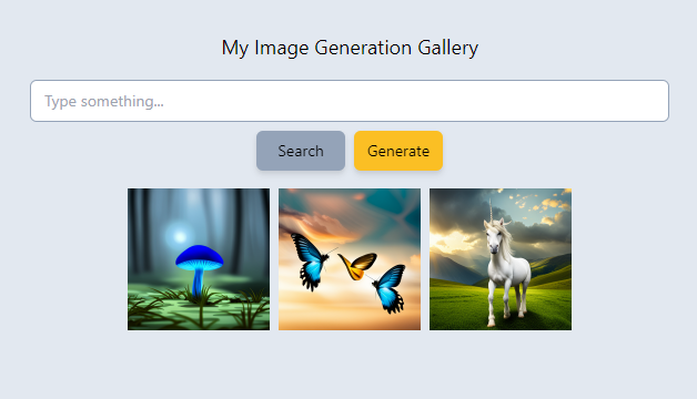 To conclude this tutorial, let's test the search capabilities of our image gallery application. Assume we've generated three distinct images using some imaginative prompts: a unicorn, a mushroom, and butterflies, as shown below.