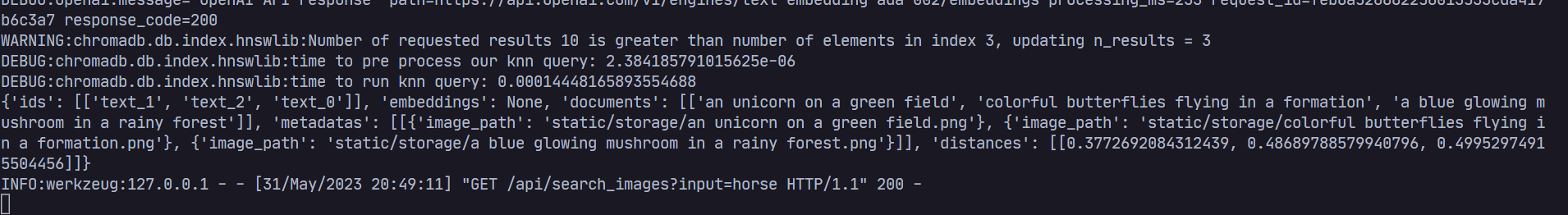Amazingly, the application returns the unicorn image as the top result! This happens even though the term "horse" wasn't in the original prompt, which was "an unicorn on a green field". It also returns images of butterflies and a glowing mushroom. These results might seem surprising at first. However, they demonstrate how embeddings capture the semantic meaning of words, leading to nuanced search results that take into account more than just exact matches.