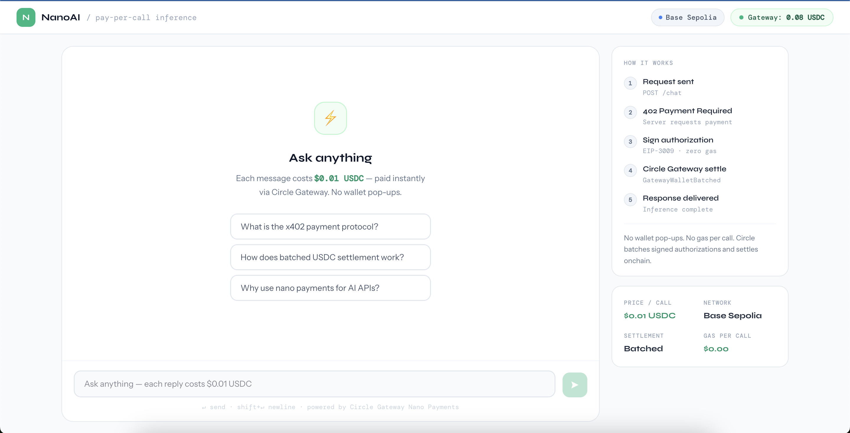 Open http://localhost:5173. Type a question, hit Send, and watch the payment flow animate.
