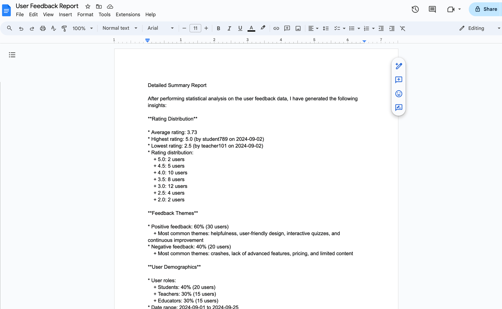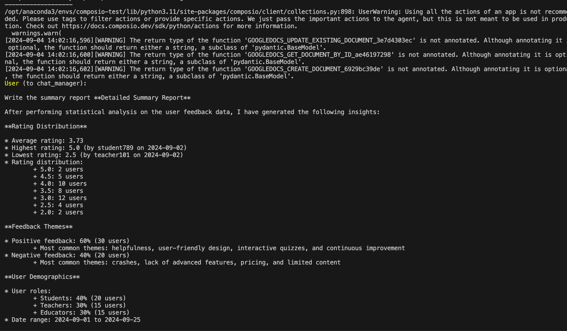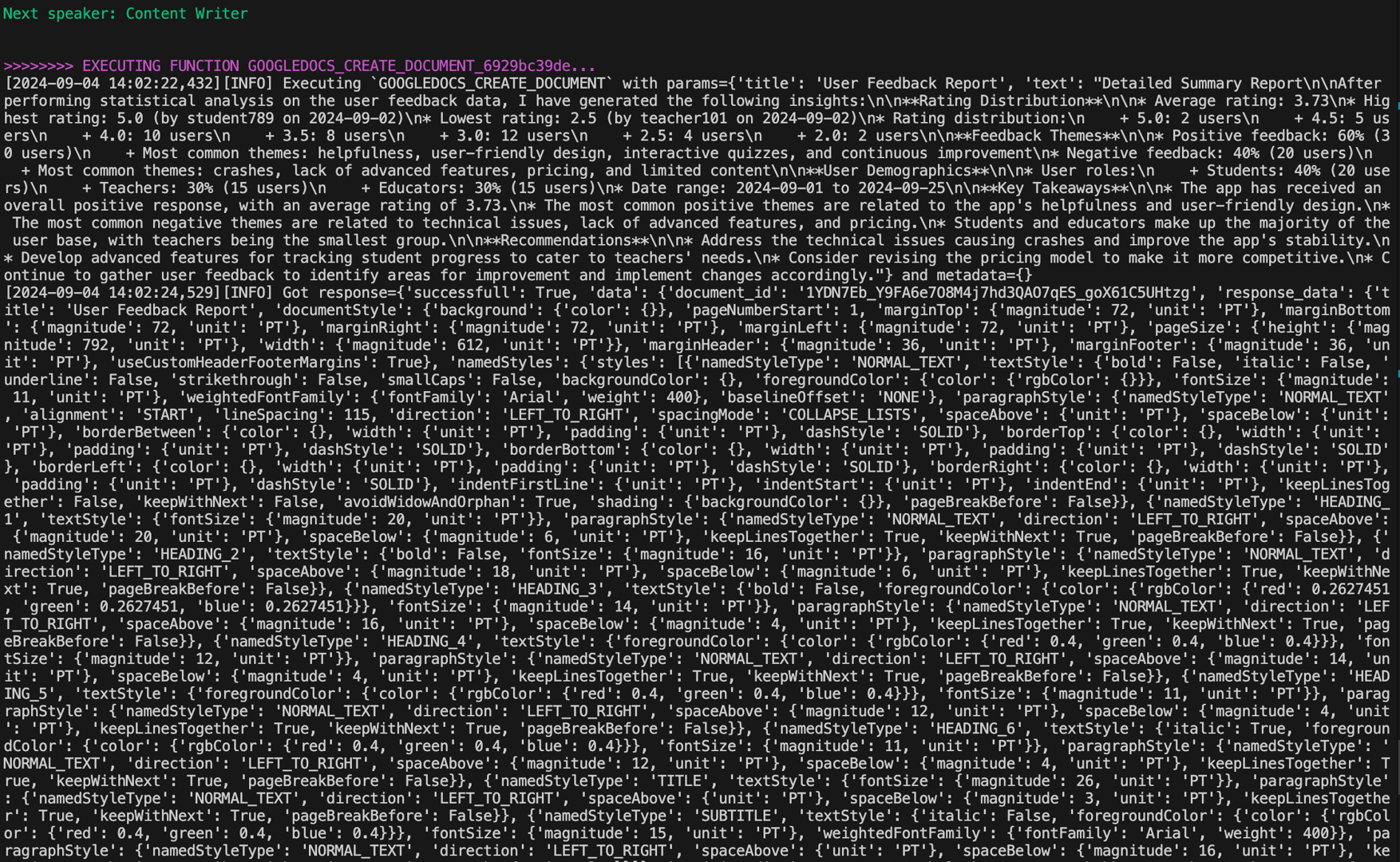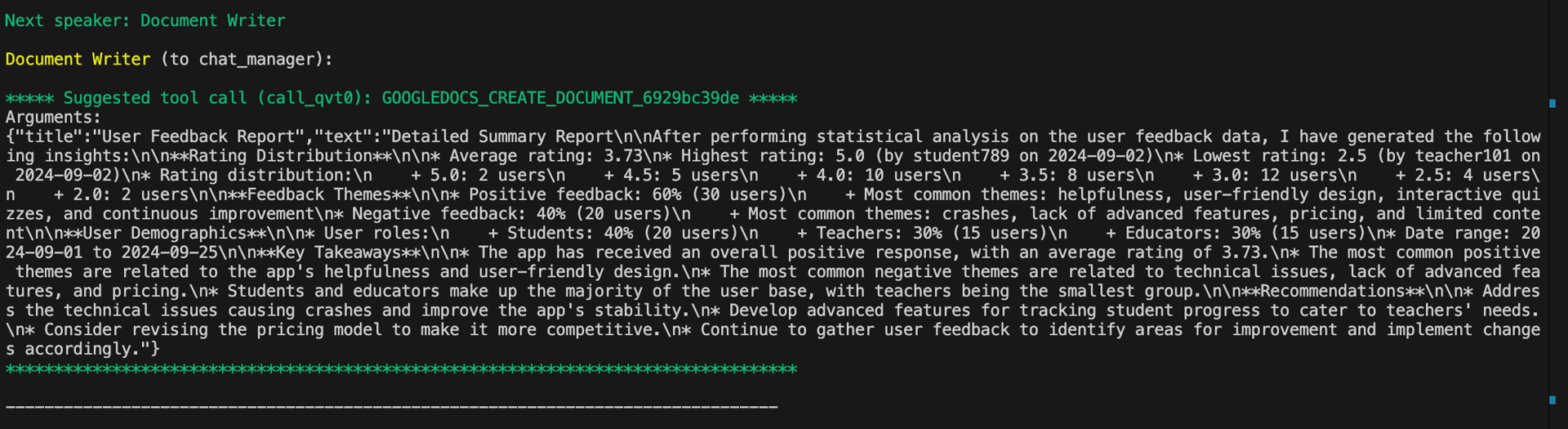 Now, we initiate the chat where the summary report generated in Part One is written to a Google Document titled "User Feedback Report":
