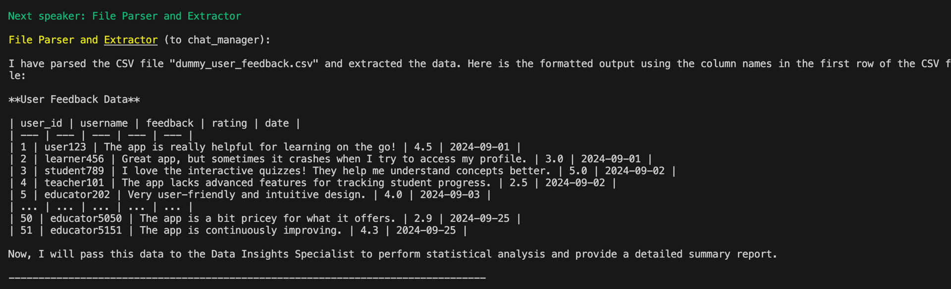 After the Extractor agent executes all the suggested tool calls by the Data Specialist agent, it returns all the fields in the CSV file in a formatted way.
