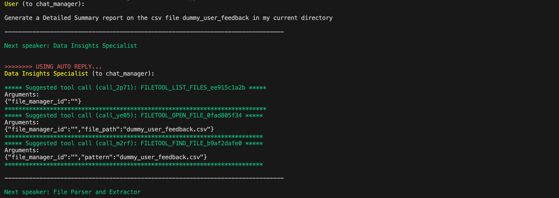 You should see all the tools available in FILETOOL, with the Data Insights Specialist Agent suggesting tool actions to perform based on the task.