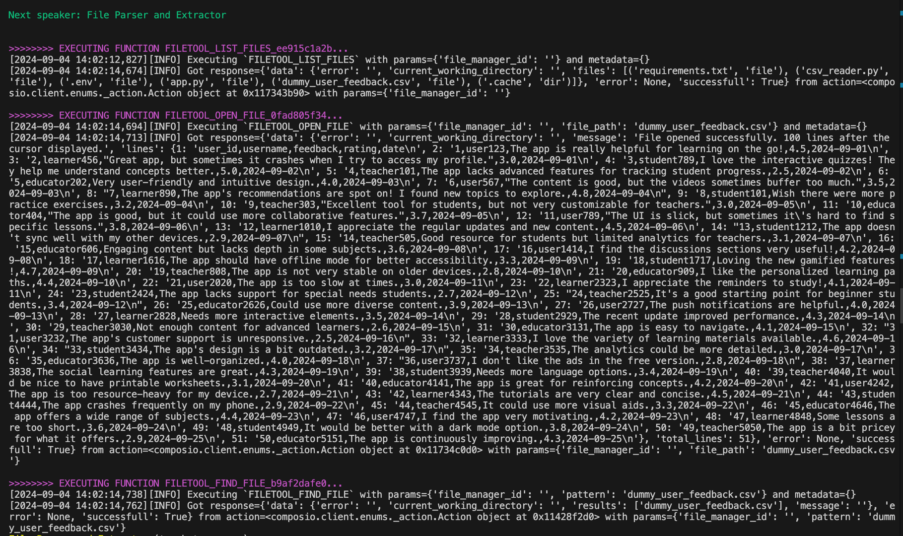The agent then delegates the execution to the FILE PARSER and EXTRACTOR agent, which we defined earlier as the executor for the FILETOOL.
