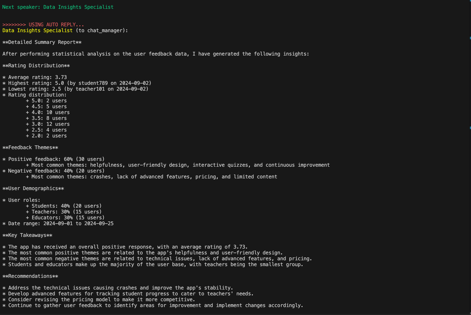 Then it gives the data to the Data Specialist Agent to generate a detailed report summary based on it. The Data Specialist Agent then generates the report summary.