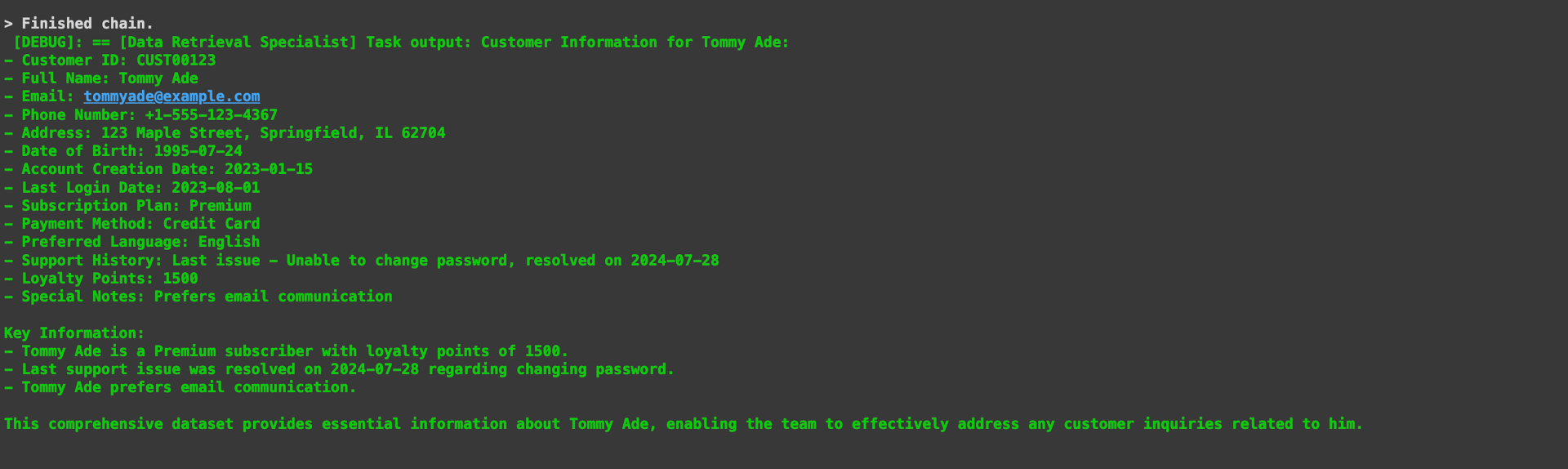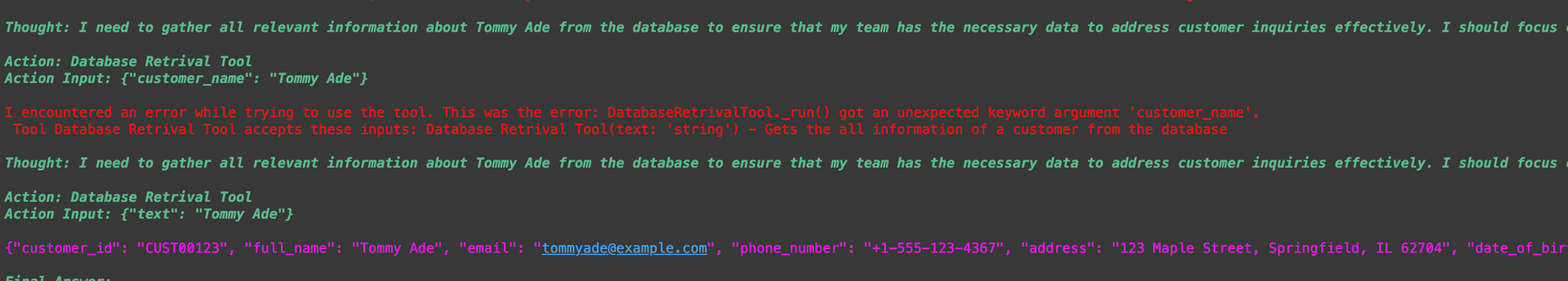 A minor error occurs when using the custom tool we defined earlier. Since CrewAI helps us to handle errors gracefully it didn’t affect the execution and made the agent pass in the right variable which gave us the customer details we wanted.