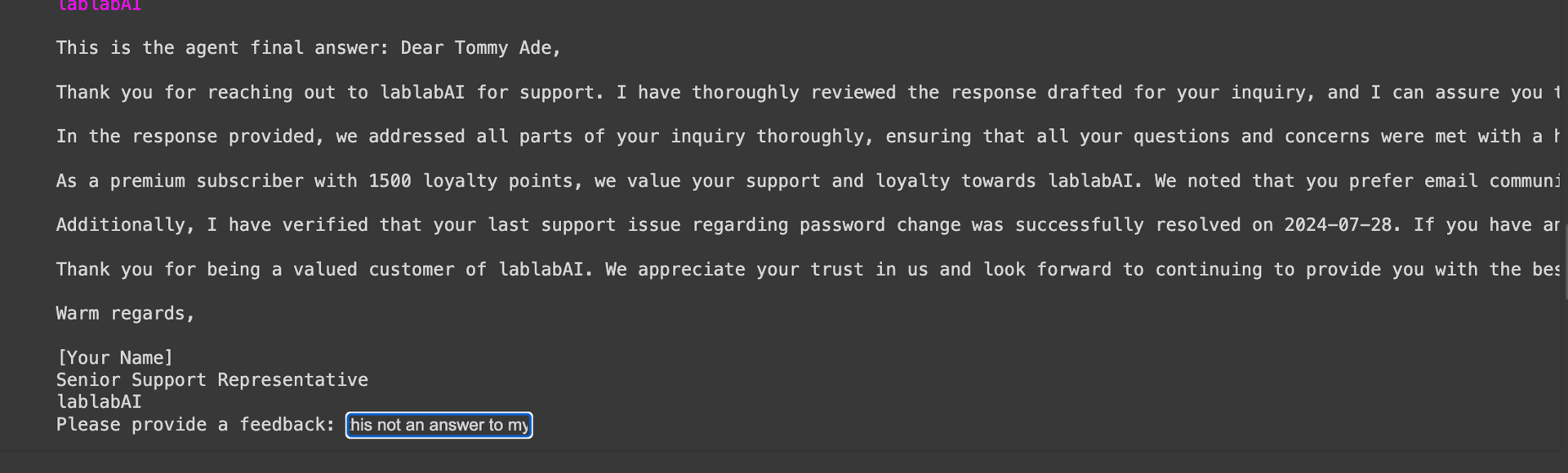 Then QA agent receives the feedback from the Support Agent and now seeks our feedback for a better response if need be.