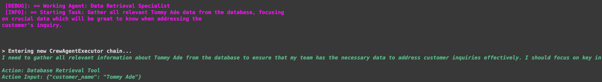 data_retrieval_agent, whose job is to gather all relevant information about the customer from the database. The data collected here will be crucial for addressing the customer's inquiry in subsequent tasks.data_retrieval_task = Task( description=dedent("""\ Gather all relevant {customer} data from the database, focusing on crucial data which will be great to know when addressing the customer's inquiry. """), expected_output=dedent("""\ A comprehensive dataset of the customer's information. Highlighting key info of the customer that will be helpful to the team when addressing the customer's inquiry. """), tools=[retrival_tool], agent=data_retrieval_agent, )In this task, the