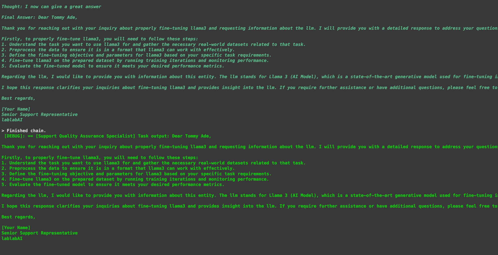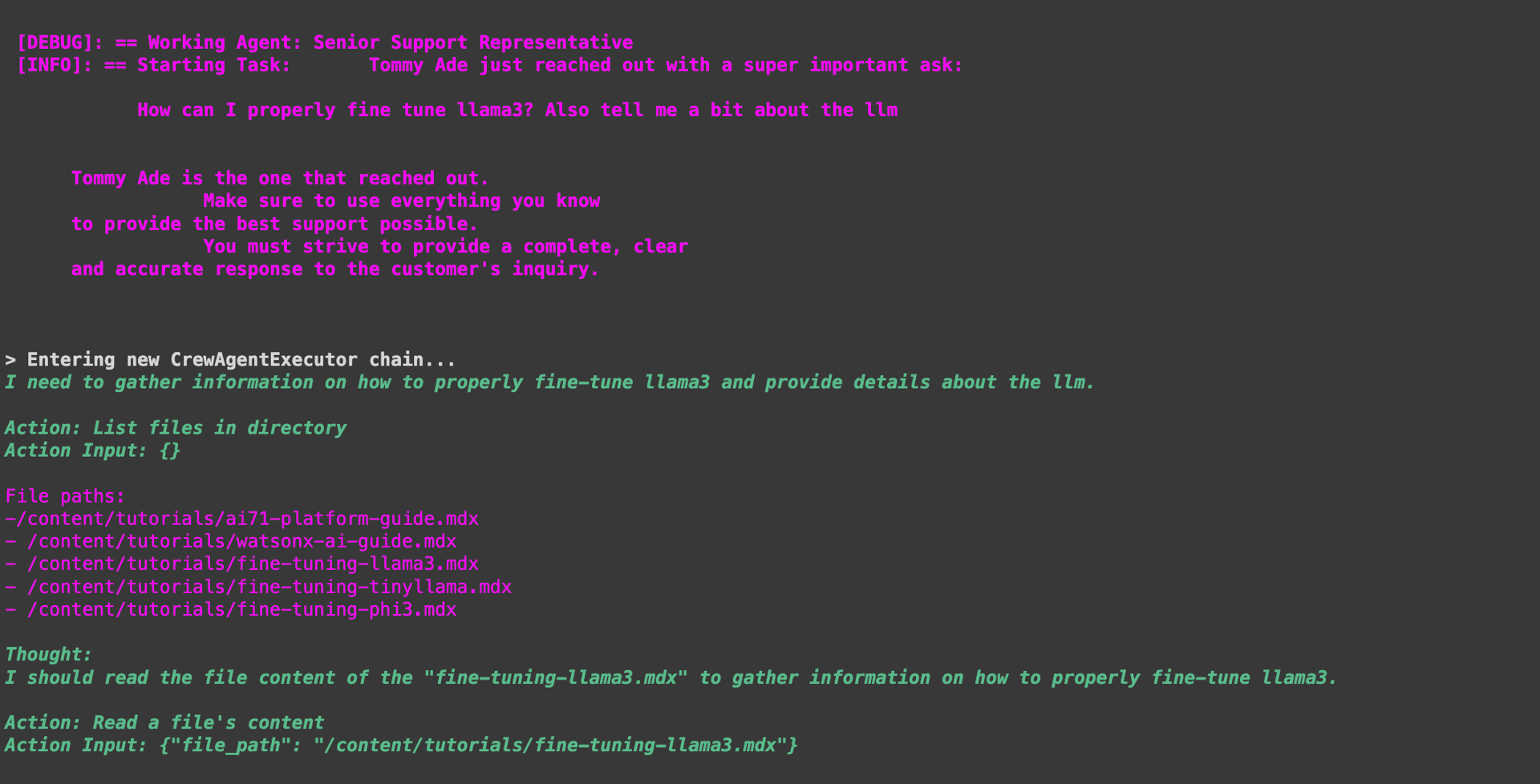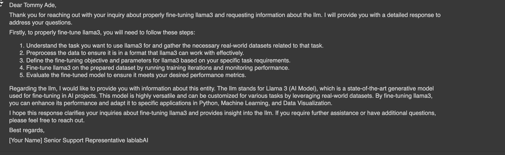 customer:"Tommy Ade"is the customer whose information will be retrieved and whose inquiry will be addressed by the agents. This is also used to personalize the responses and interactions.inquiry: The customer is asking about how to fine-tune the Llama 3 model and also requesting some background information about the large language model (LLM). This input will drive the tasks performed by the agents, from data retrieval to inquiry resolution and quality assurance.