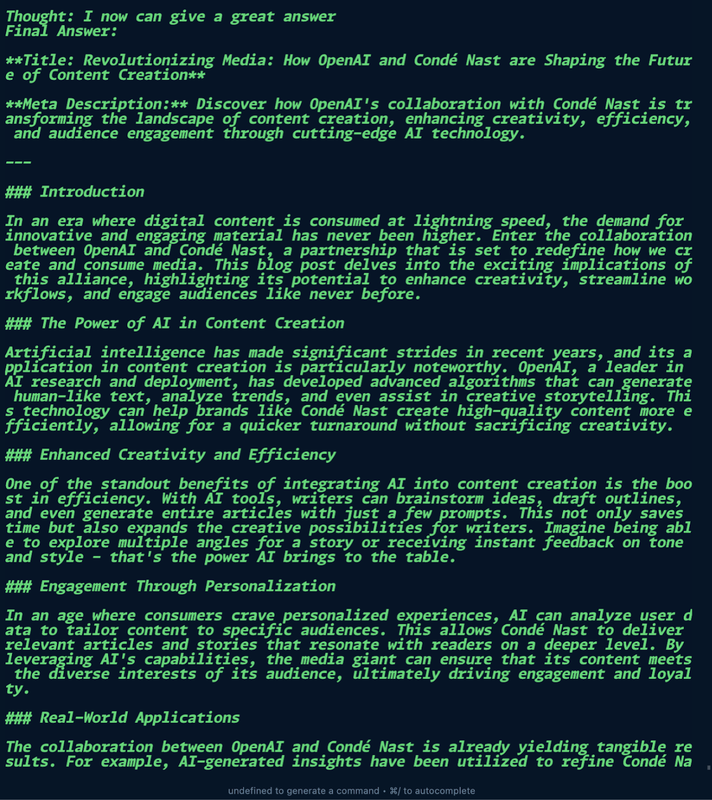 - blog_post.md: This file contains the final content generated by your agents. For example, if your task was to create a blog post, this file will have the complete draft, including all sections as planned by the agents.