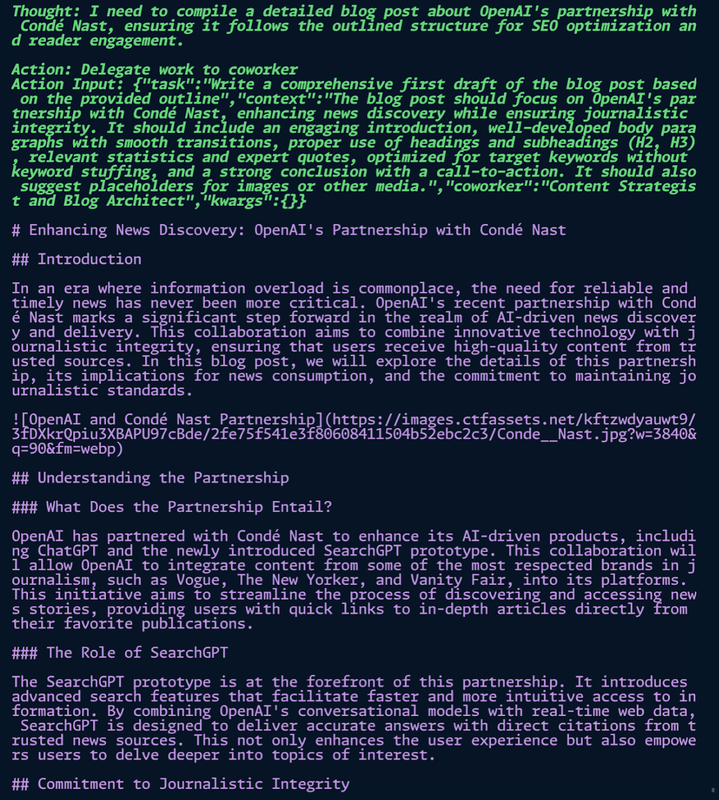As you continue to explore and refine your project, you can build upon this foundation, adding more complexity or tailoring the agents to specific needs. Whether you’re looking to automate content creation, streamline research processes, or implement sophisticated workflows, CrewAI offers the tools to make it happen. Happy coding!