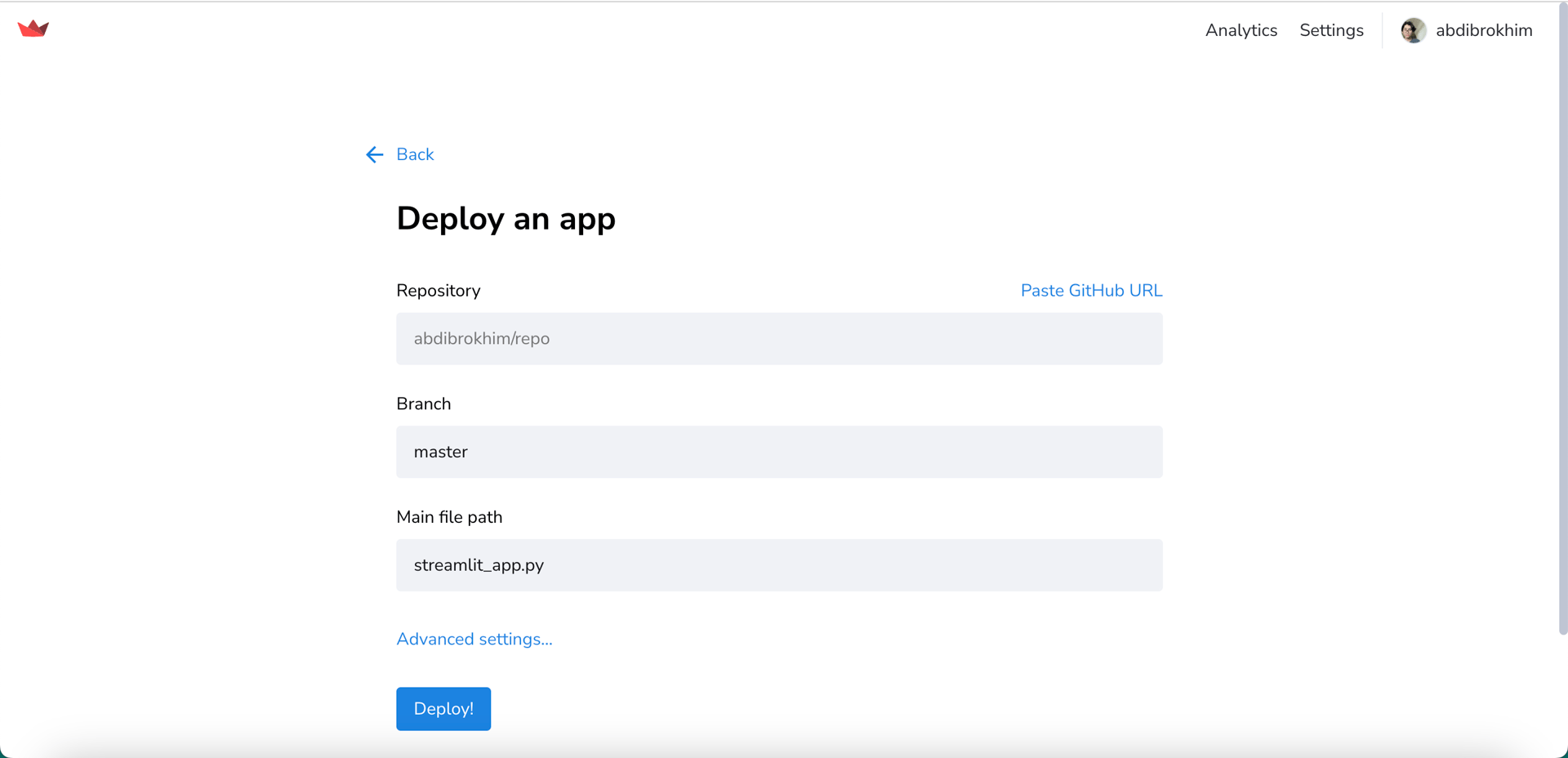 Click on the New app button and fill in the details. Choose the repository, branch and main file path app.py in our case. Then, click on the Deploy! button.
