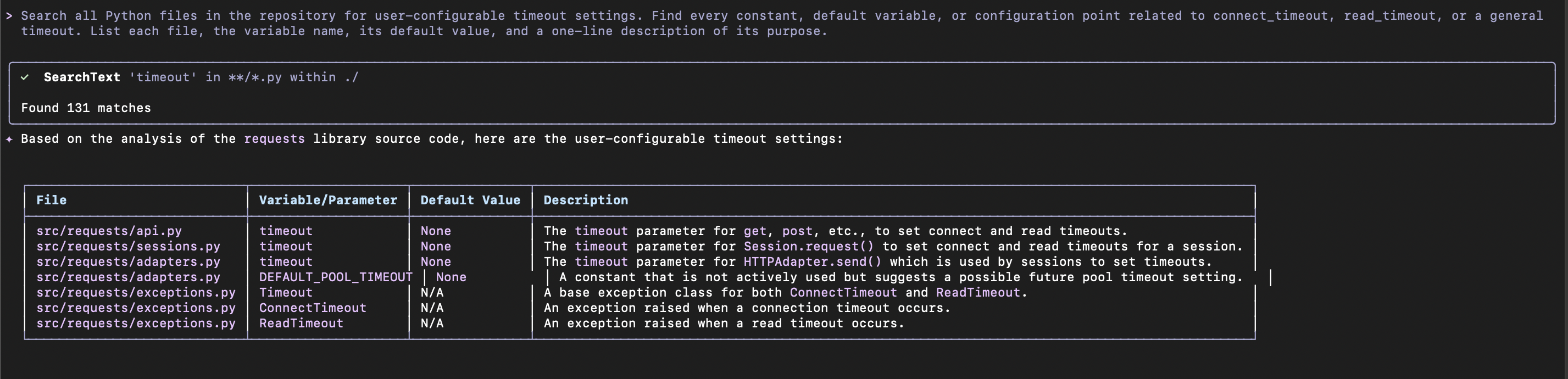 Claude took a different path. Instead of just finding the settings, it spent a minute exploring the code to understand the entire timeout system. Its response was a mini-tutorial: it explained the three timeout formats, traced the parameter's flow through the API, Session, and Adapter layers, warned about the dangerous default of None, and mapped out the exception hierarchy.