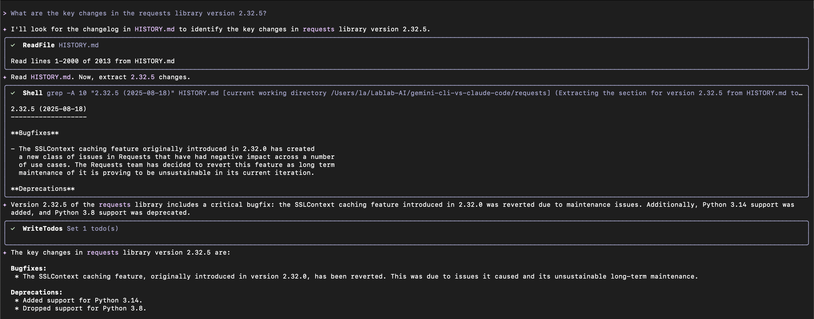 Claude didn't know the answer from memory. Instead, it executed a flawless investigation within the repository: It checked the version file, searched for changelogs, found HISTORY.md, and synthesized a detailed report. It provided crucial context about the reverted SSL caching feature and the version's place in the release lineage. It found truth locally.