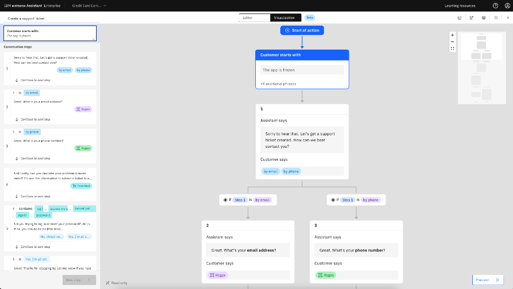 - Toggle between Edit and Visualization tabs to see action flows as a flowchart.
