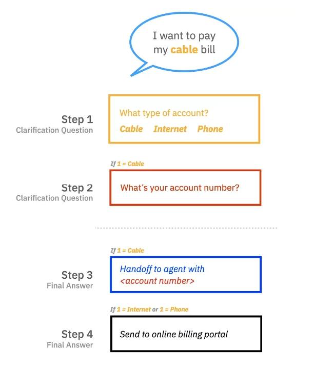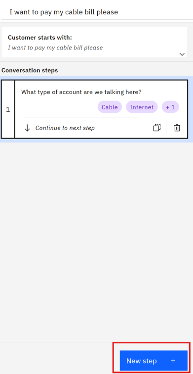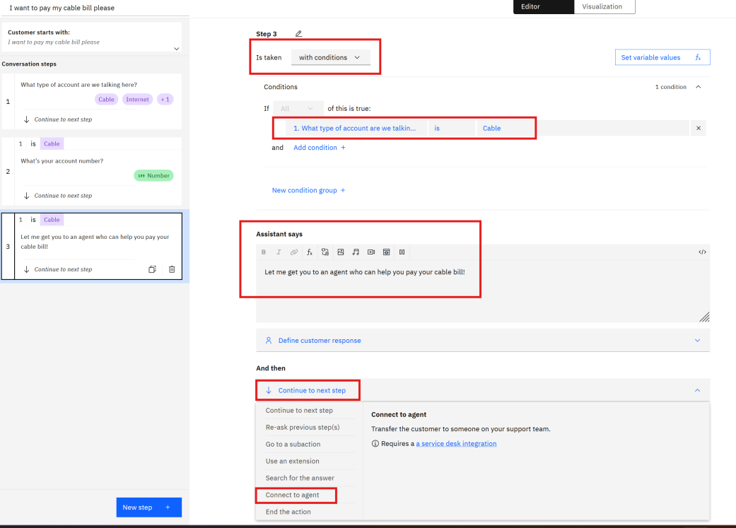 Add a step saying, “Let me get you to an agent who can help you pay your cable bill!” and set it to connect to an agent under specific conditions (e.g., when Step 1 is “Cable”).