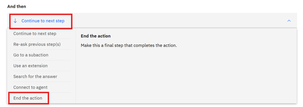 - Finally, under And then section, select Continue to next step drop down and select End the action option.