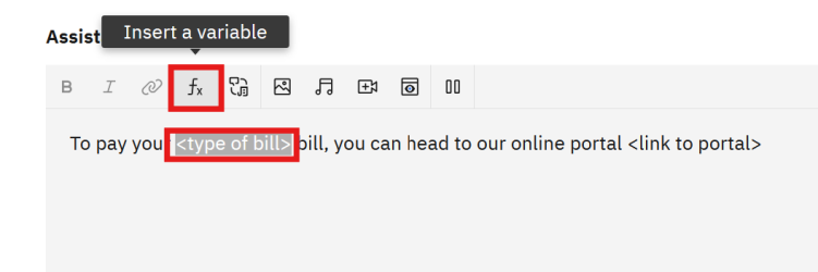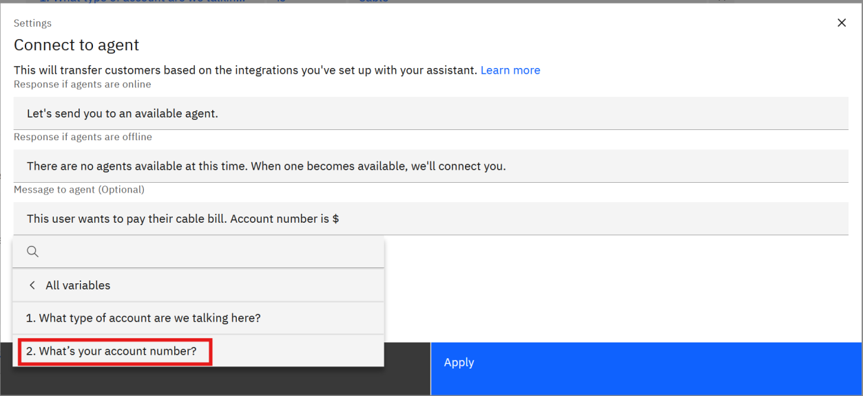 $[variable from Step 2]”.Configuring agent message