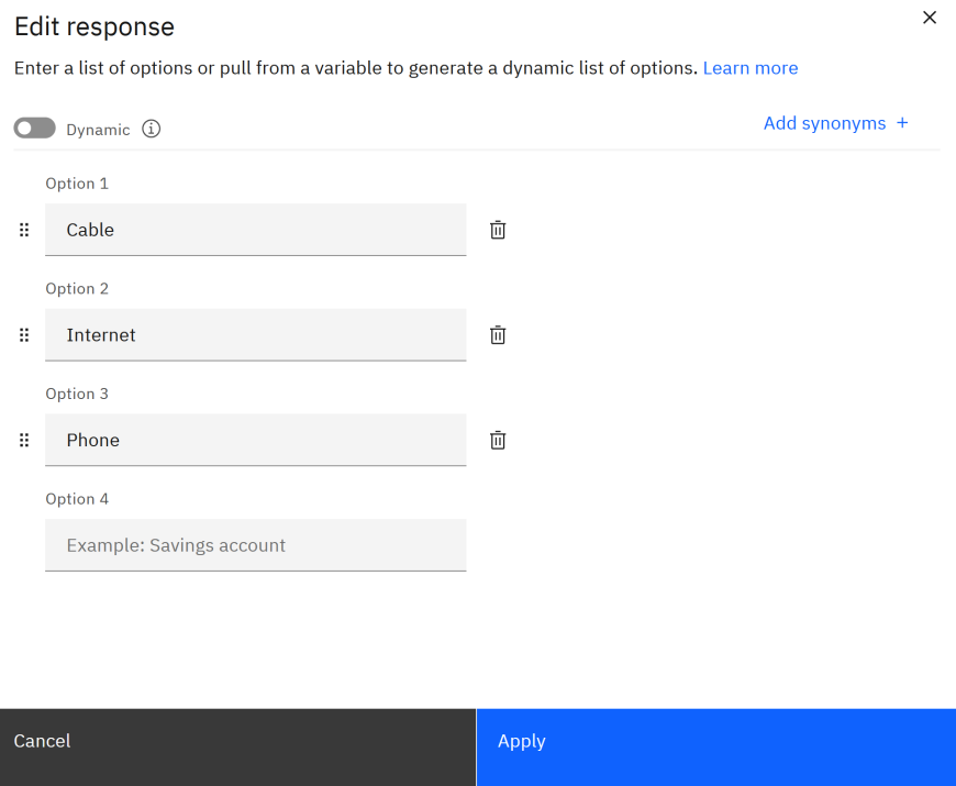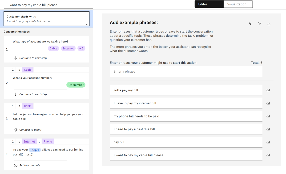Train the assistant by entering example phrases such as “I want to pay my cable bill please” and save them to help the assistant recognize related topics.