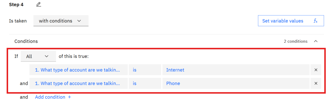 Apply conditions to ensure this step triggers when the answer is “Internet” or “Phone”.