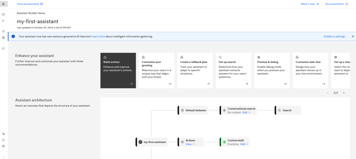 An Assistant will be created, and you will be taken to its home page. Now you are ready to begin building your first assistant.