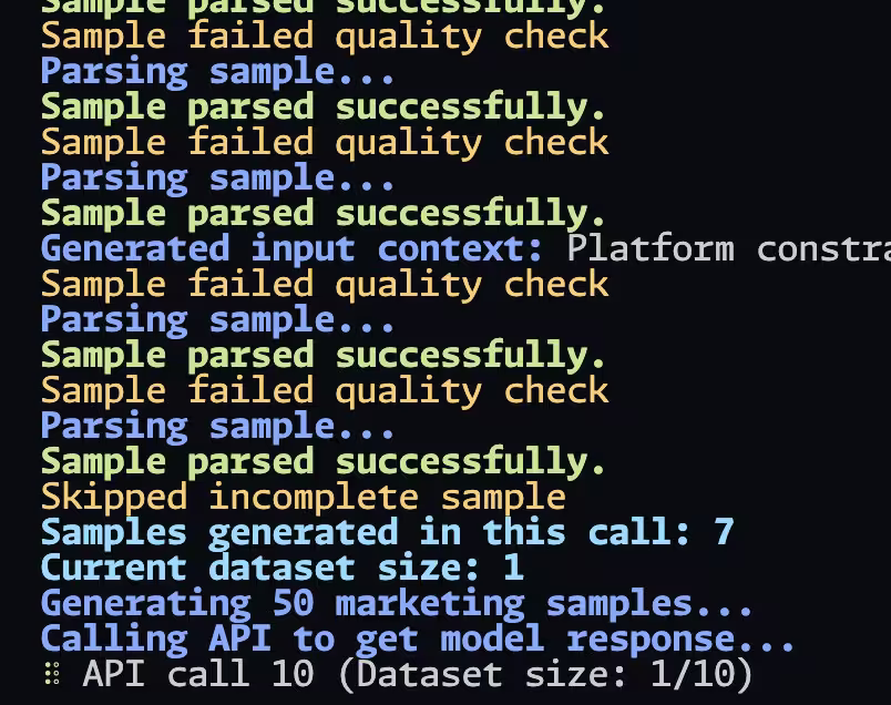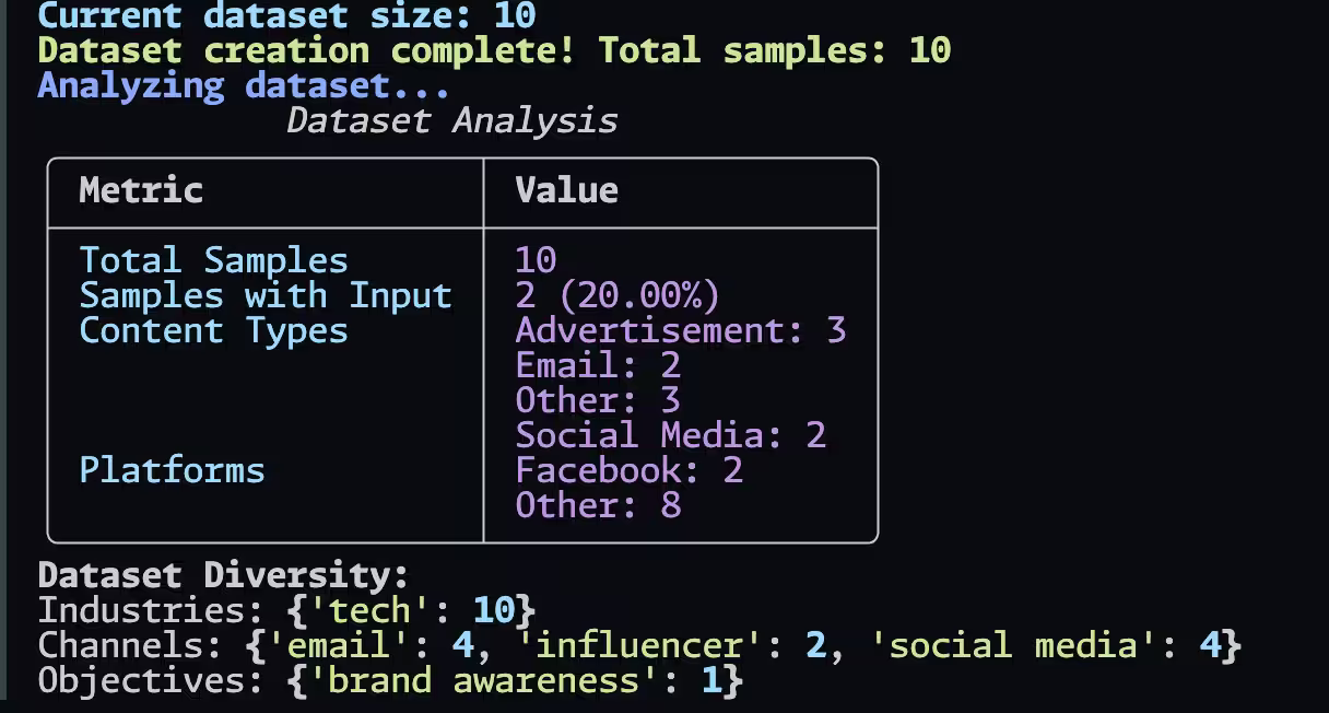 system_message = f"""You are an elite marketing AI, tasked with generating {num_samples} exceptional, diverse, and innovative marketing scenarios. Each scenario must be unique and push the boundaries of creative marketing. Your goal is to create a dataset that will revolutionize AI-assisted marketing when used for fine-tuning.