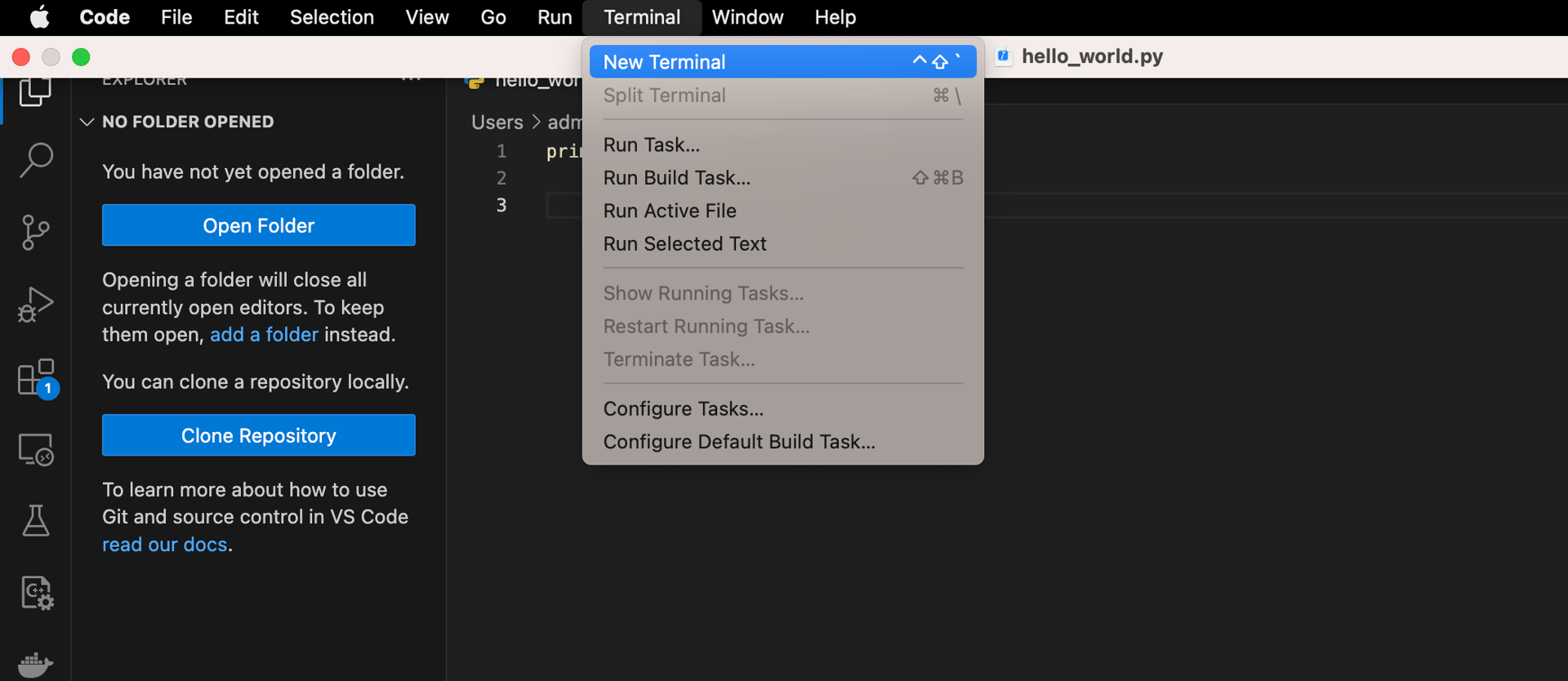 Open a terminal in VS Code by clicking Terminal > New Terminal.