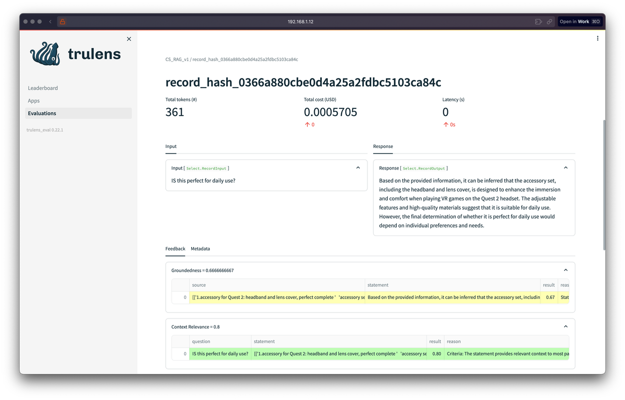- The feedback scores for "Groundedness", "Context Relevance", and "Answer Relevance" are right there too, with color-coded indicators for a quick visual cue: green for good, yellow for okay, and red for needs attention.
