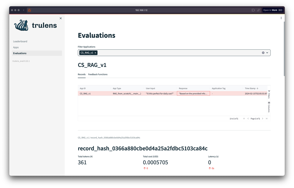 Once you've got your Flask app up and running, you'll notice that the TruLens dashboard is also live and kicking on port 4000.