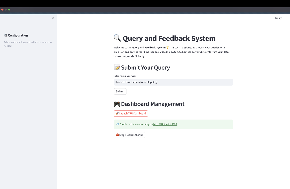 streamlit: This is a Python library used to create web applications quickly. It's being used here to create the user interface for the Query and Feedback System.setup: This is a module that contains thesetupfunction, which is responsible for setting up the system's configurations. It's important to note that this function should only set up configurations and not load data.QueryManager: This is a class imported from thequery_managermodule. It's responsible for handling all query-related operations.FeedbackManager: This is a class imported from thefeedback_managermodule. It's responsible for managing user feedback.Tru: This is a class imported from thetrulens_evalmodule. It's used for launching the TRU Dashboard.