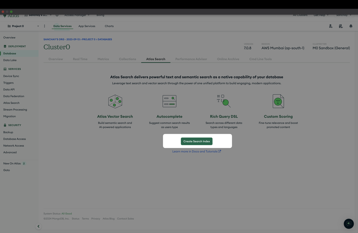 After entering the JSON configuration, submit the form to create the index. MongoDB Atlas will begin building the index, which may take some time depending on the size of your data.