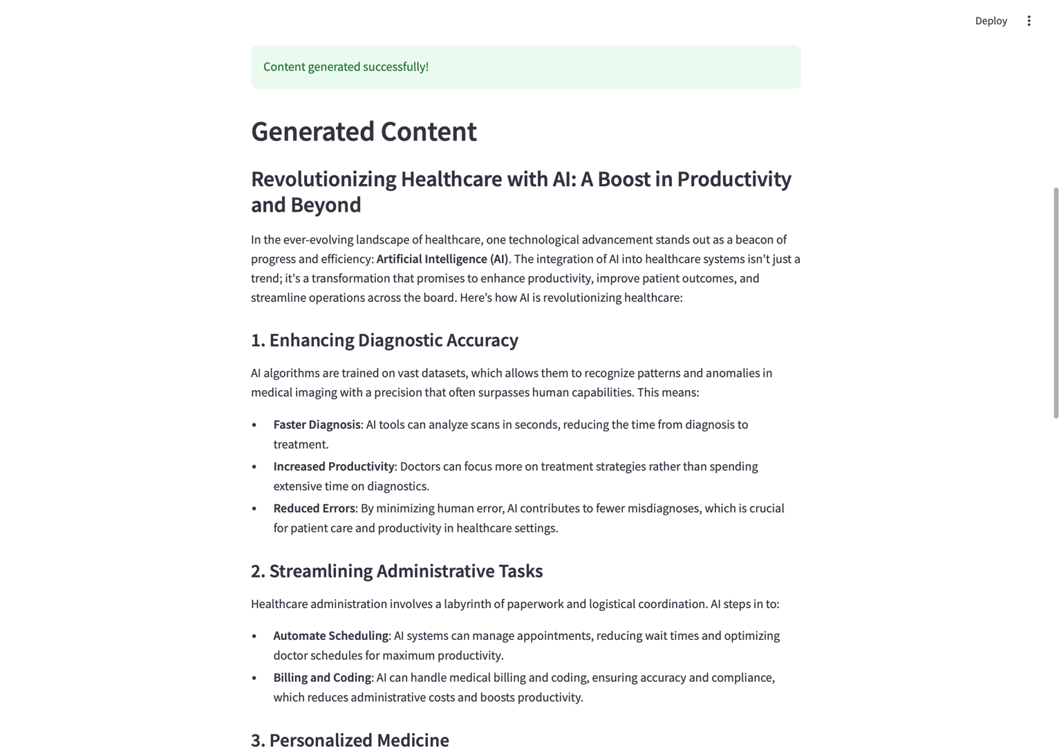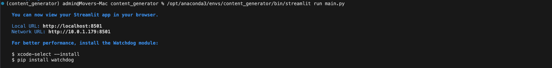 /opt/anaconda3/envs/content-generator/bin/streamlit run main.pyAlternatively, if your Conda environment is activated: