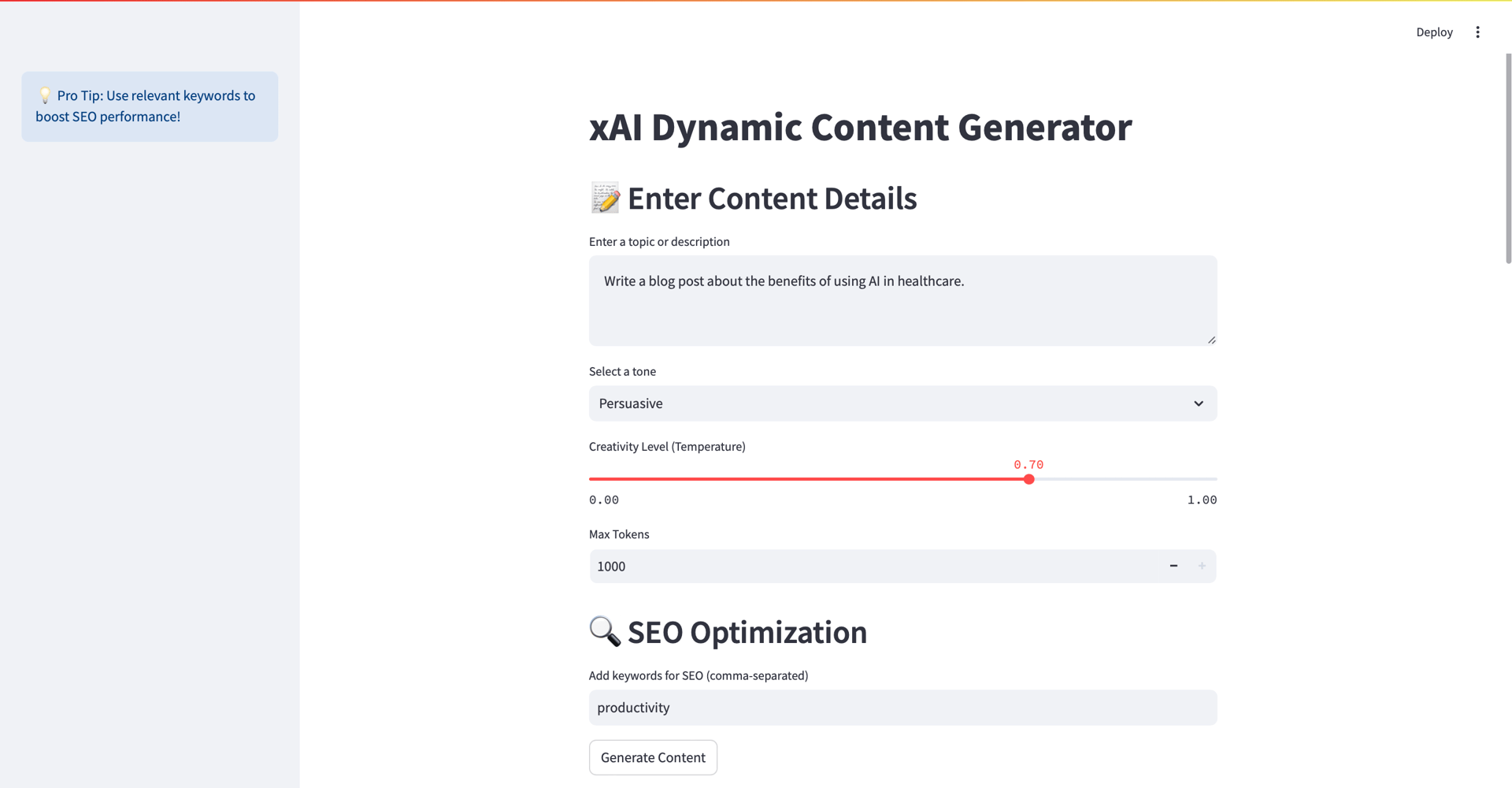 content_generator.py: Handles interaction with the xAI Grok API.utils.py: Contains helper functions, like saving generated content to a file.main.py: The entry point for the Streamlit-based UI.