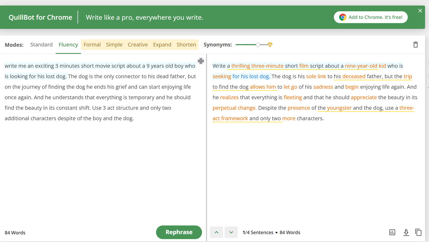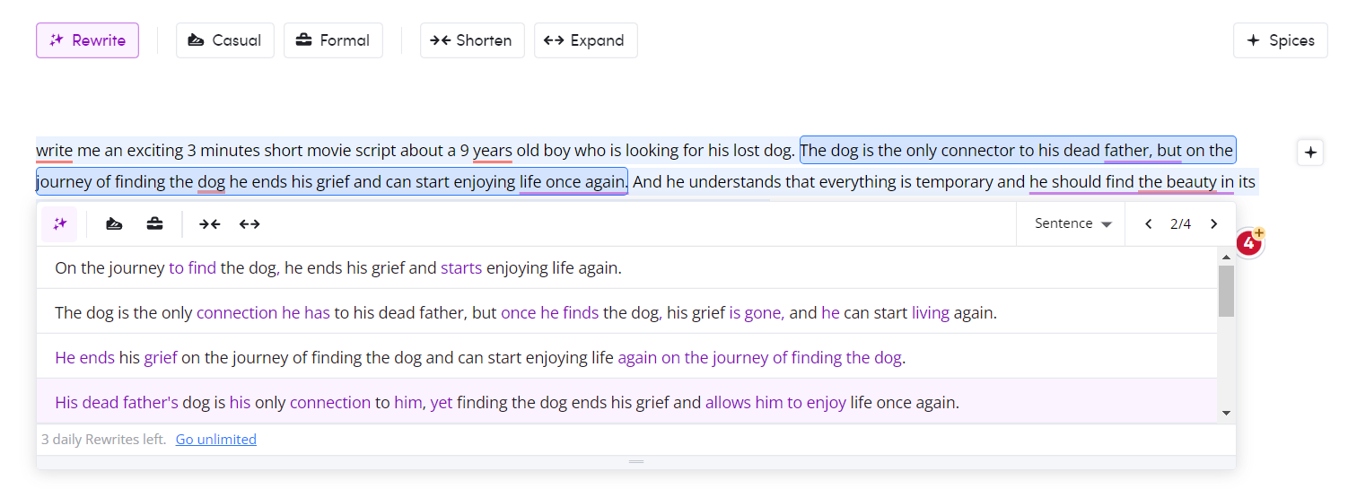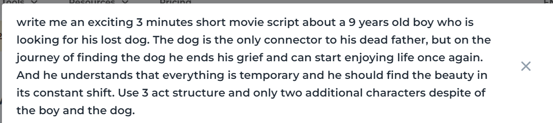 An amazing rewriting tool from AI21. It cannot write you the script itself, but it can help you to brainstorm it. It can help you rewrite a treatment, outline, or logline, shorten it or make it longer or even more formal. There are some daily free credits to help you improve your work for free.
