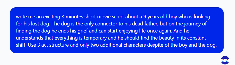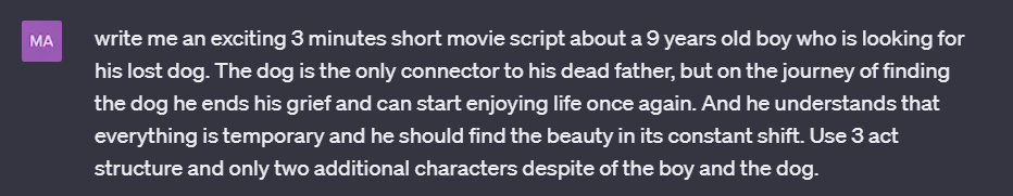 Also we played with short forms, but if you scaled up to a feature movie script results won’t be that interesting. You have to be aware that AI can help you to leverage your potential to the next level, but it won’t replace your work. It’s not a promise nor a threat - it’s how it is. You don;t have to write everything manually, you can use a computer. You don’t have to get inspiration only by reading and researching the internet - you have an AI assistant to join you on the creative journey.