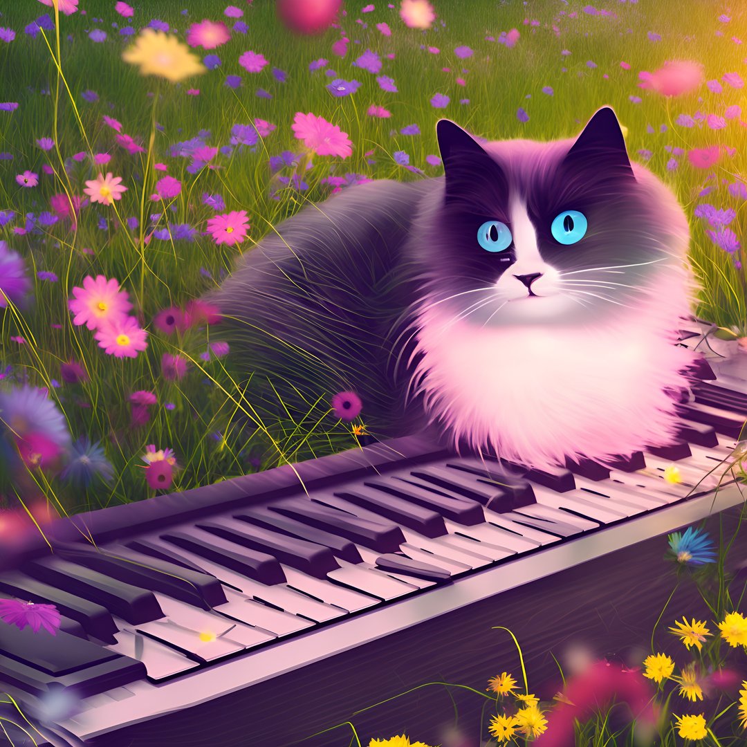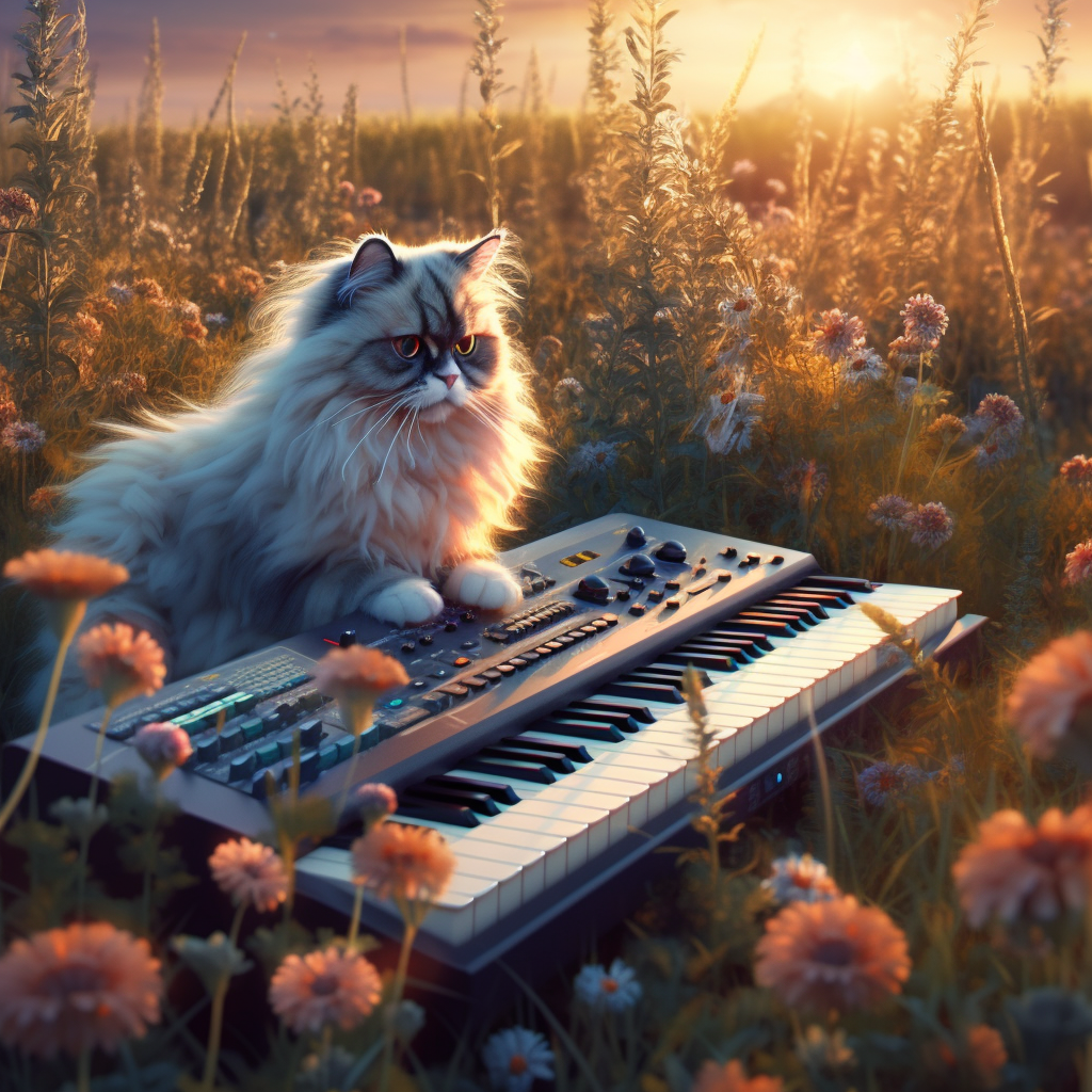 During a sunset a cute ragdoll cat sitting on a keyboard in a meadow full of wildflowers, children book art style, 8k, high resolution