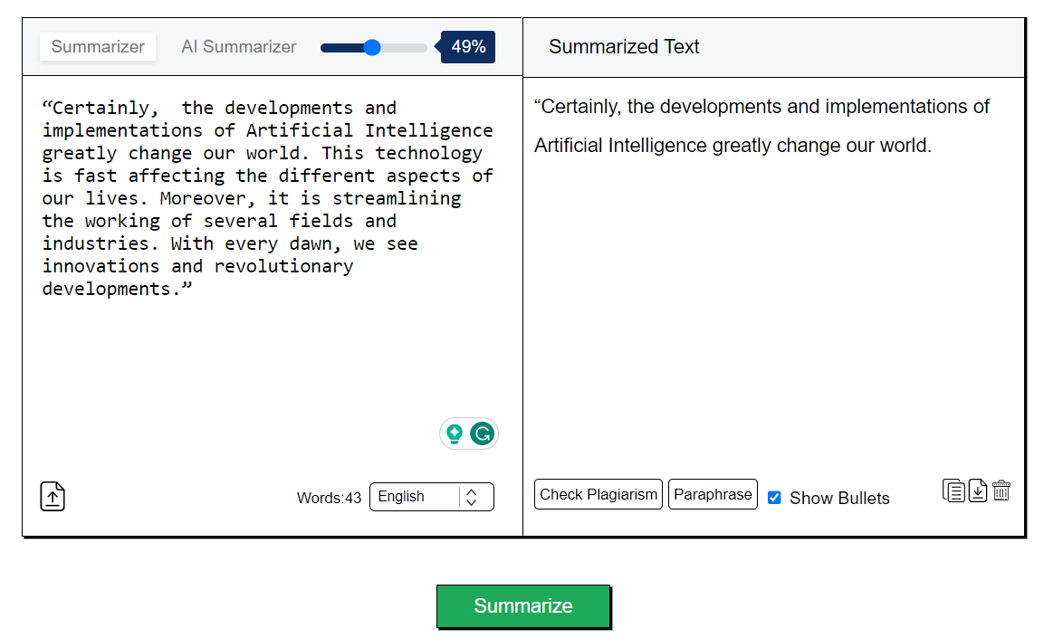 - The AI summarizer uniquely explains the key points without copying and pasting original words. For this, the tool uses human-like terms and phrases. The tool does so to make the output look like it is written by a human.