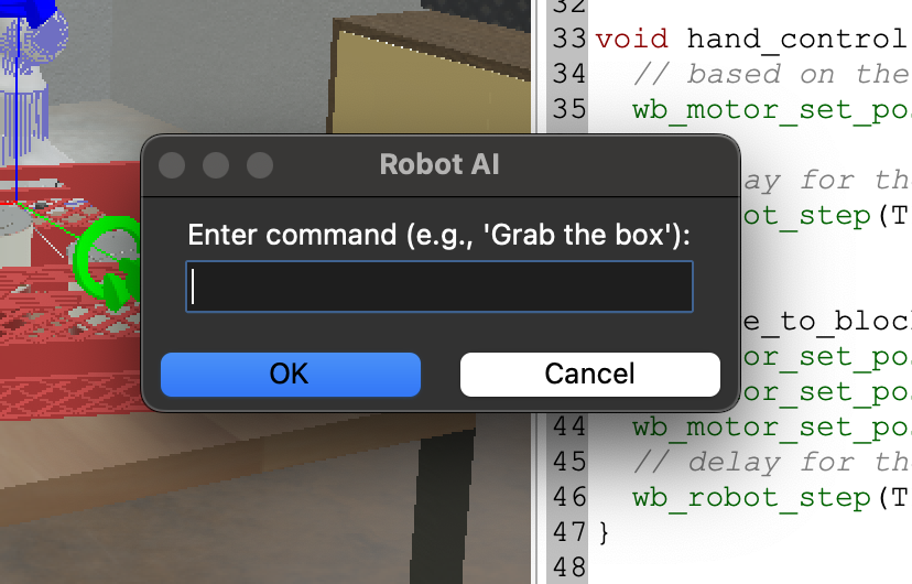 tkinterfor creating a simple dialog interface to receive user commandsgoogle.genaifor accessing the Gemini AI modelcontroller.Supervisorwhich gives us advanced control over the robot and world state