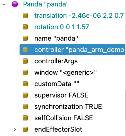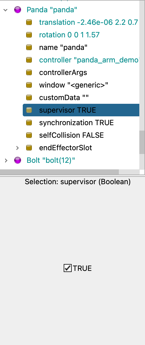 In the Webots Scene Tree, select the Panda robot. Find the field supervisor and change it from FALSE to TRUE. Save the world and reload the simulation.