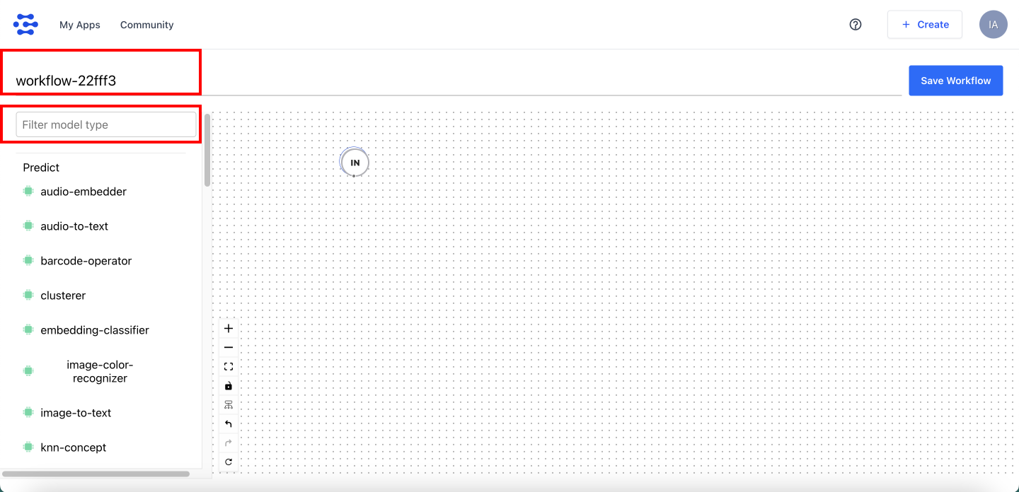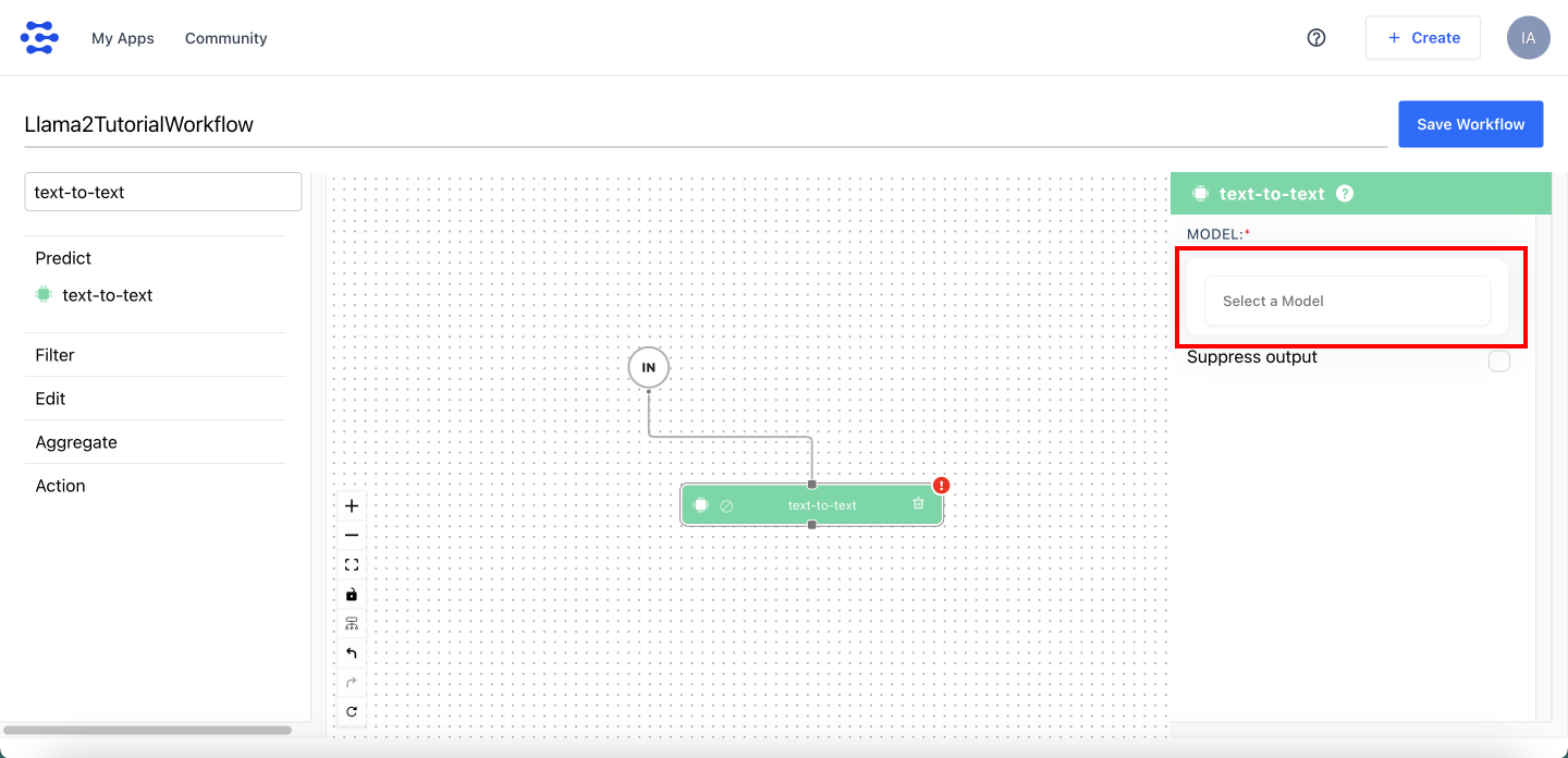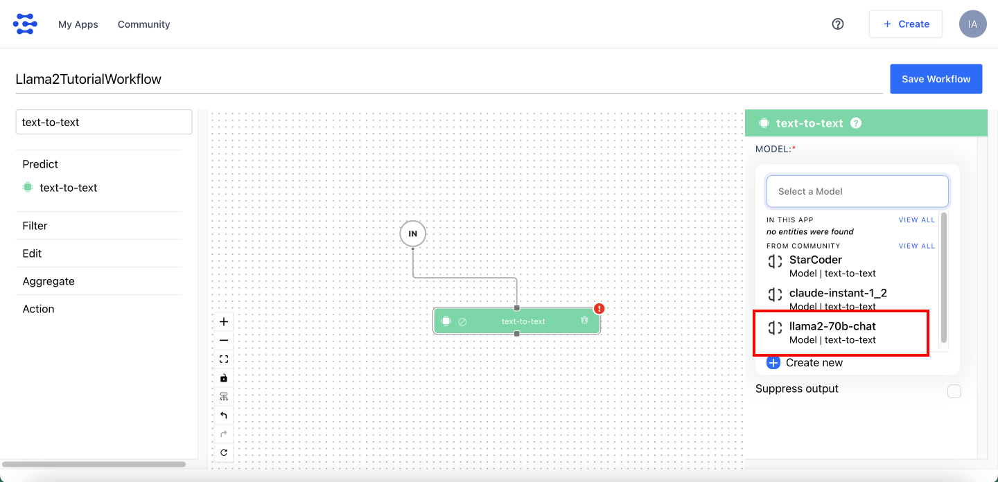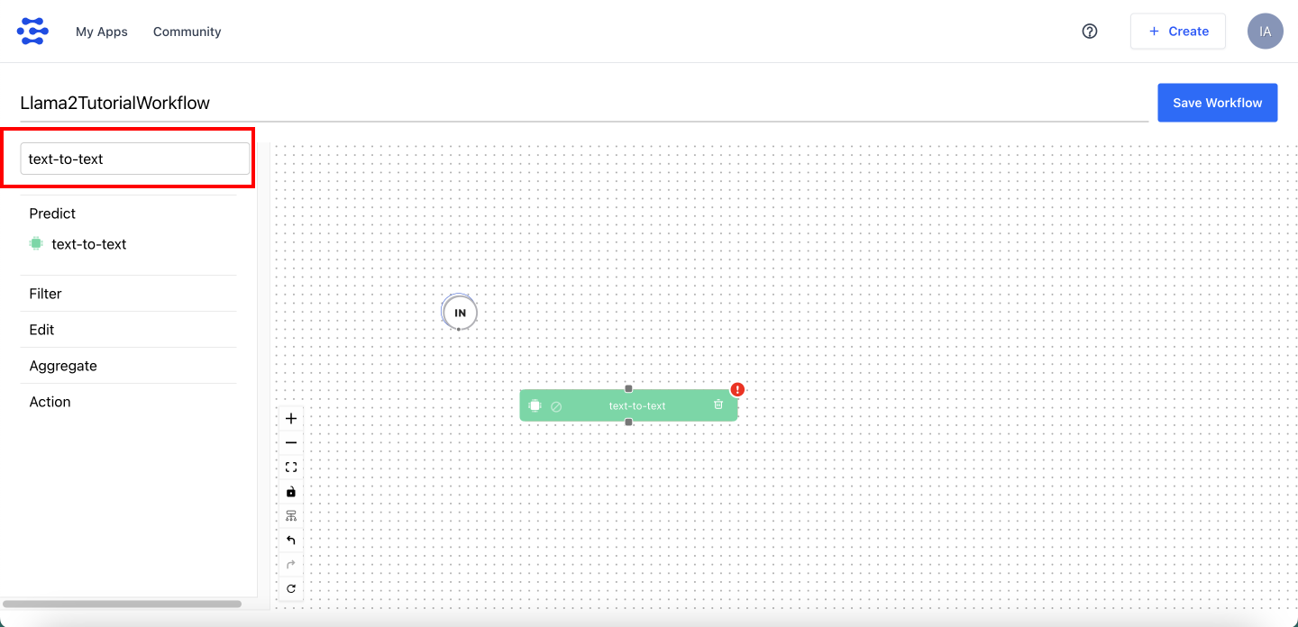 Firsly, change the default workflow's name to something readable: Llama2TutorialWorkflow, then in the left sidebar, search for Text-to-text component, drag and drop it to the canvas and connect with IN. In the right sidebar, you can see the properties of the selected component. Select llama2-70b-chat model from the dropdown list. Then, click on the Save Workflow button.