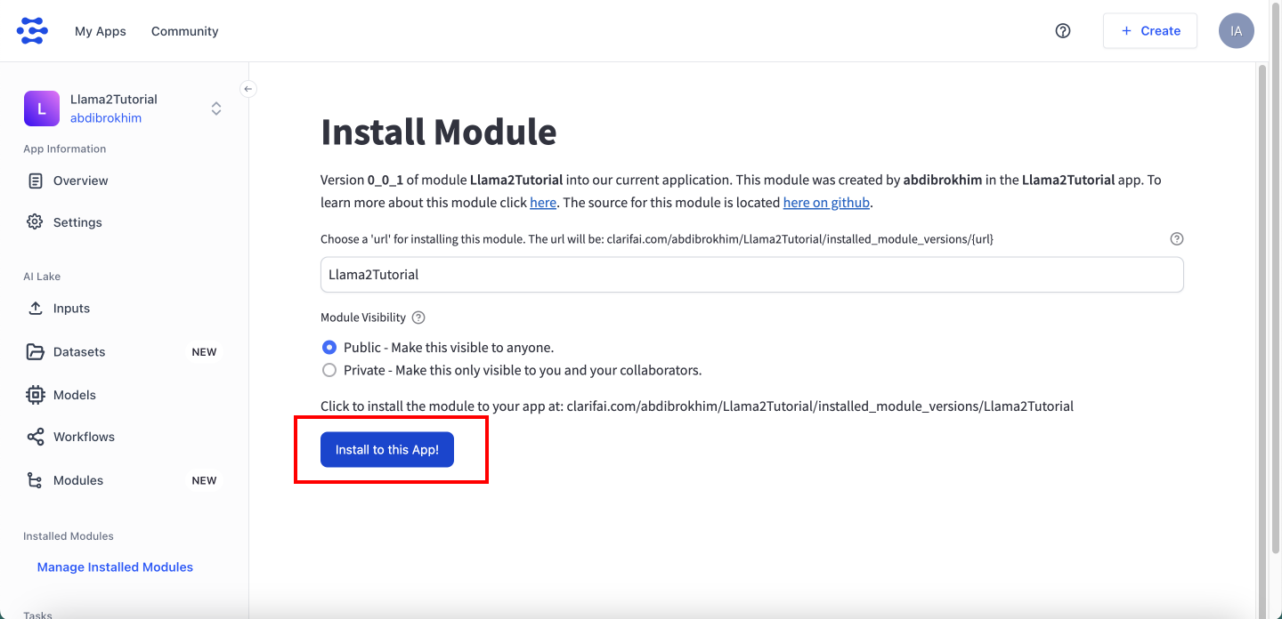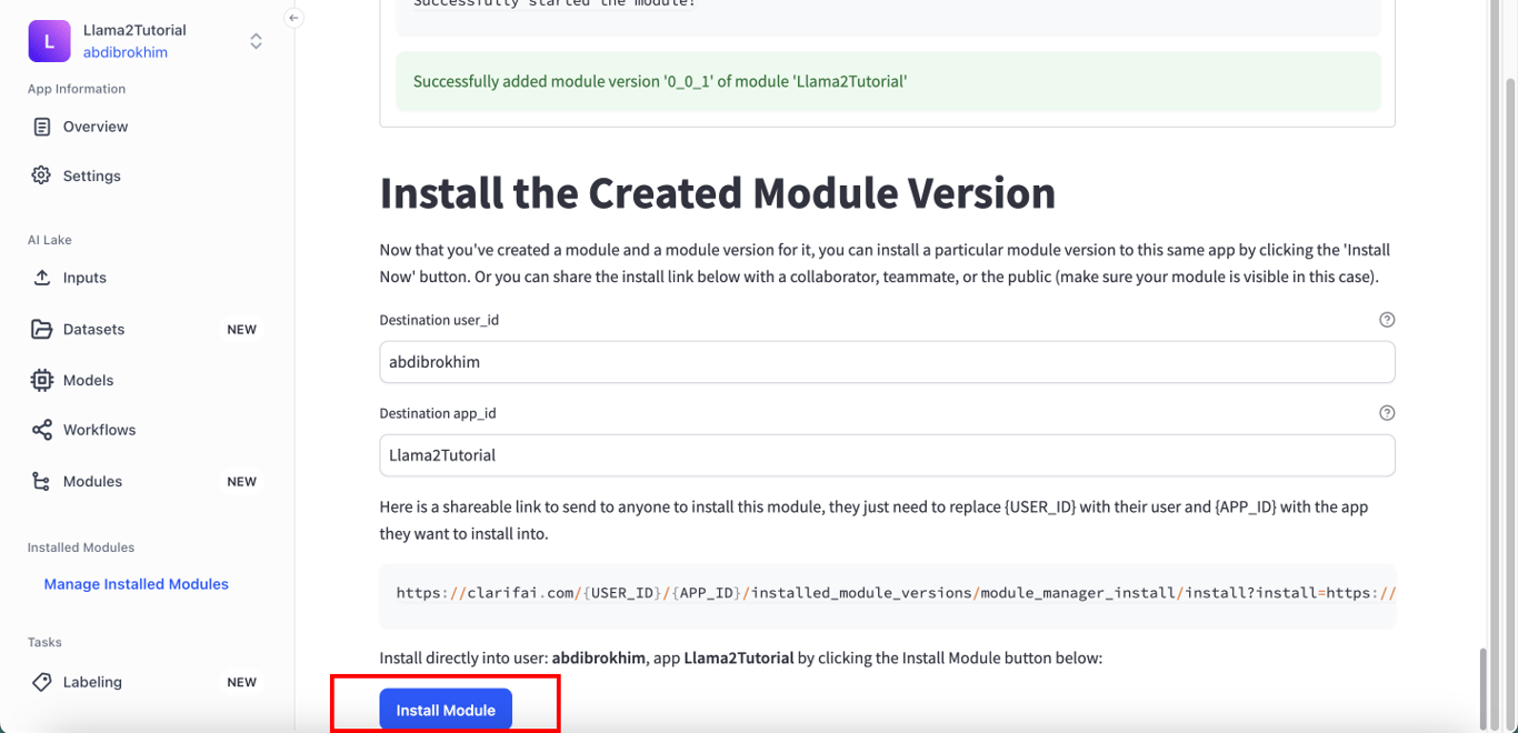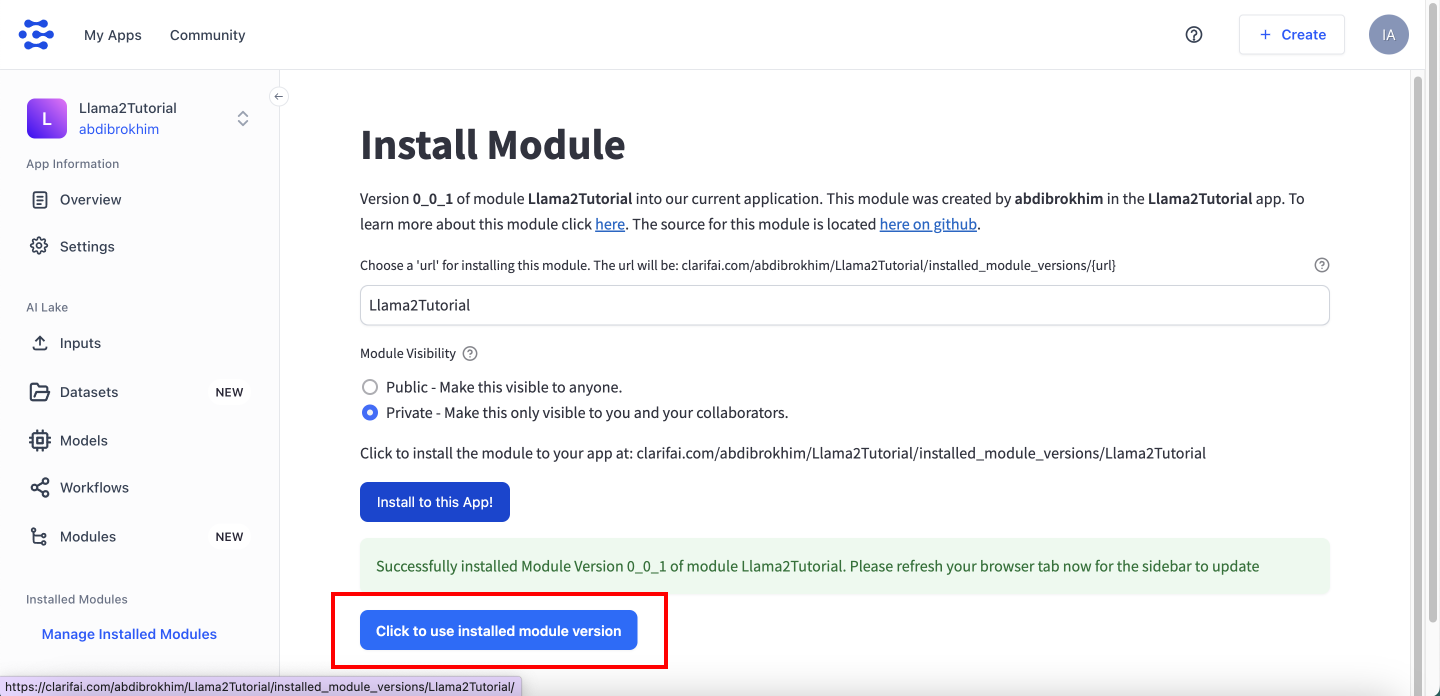 Once it is ready, scroll all the way down and click on the Install Module - Install to this App - Click to use installed module version - Authorize buttons.